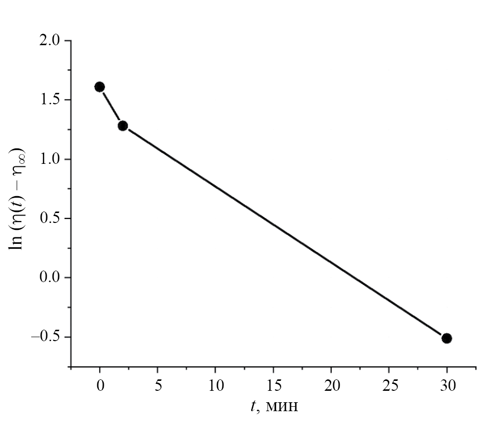 На рис. 6 приведен график зависимости логарифма разности ln(η(t) - η∞) для МЖ с СНЧ длиной 1.3 мкм и ω = 0.05 с-1. Выбрана частота для наиболее выраженного магнитореологического эффекта при B = 0.25 Тл. Практически линейная зависимость графика позволяет оценить время релаксации θ ≈ 30 мин.