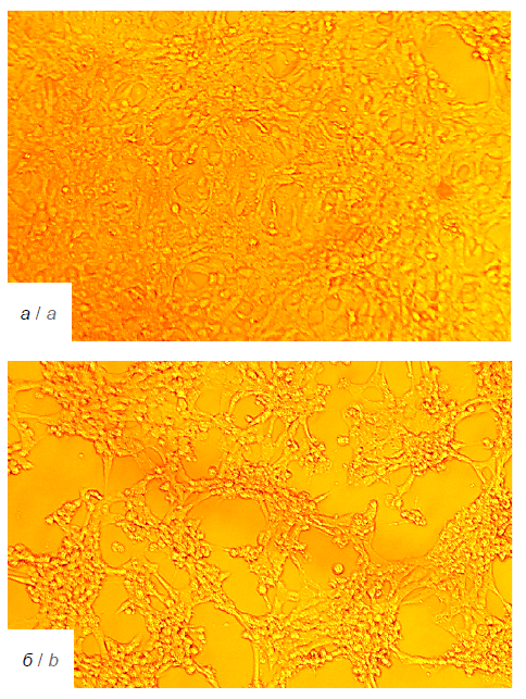 Рис. 2. Цитопатогенное действие штамма Dubrovka-са в культуре клеток Vero при 23ºС (7-е сутки после инфицирования). а — незаражённые клетки; б — Dubrovka-са. MOI 0,001.