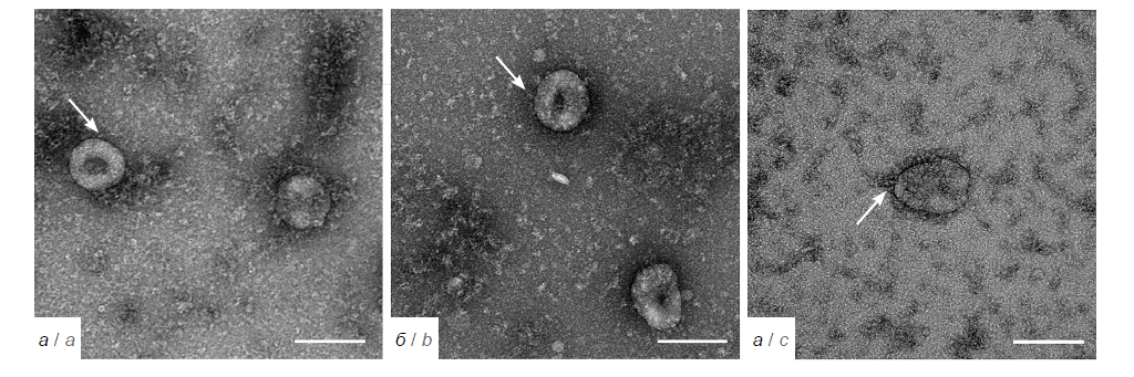 Рис. 4. Электронная микрофотография инактивированных УФ вариантов SARS-CoV-2. а — Dubrovka; б — Dubrovka-са-B4; в — Dubrovka-са-D2. ТЭМ. Негативное контрастирование 1% уранилацетатом.Стрелками отмечены тримеры S-белка на поверхности коронавируса. Масштабный отрезок — 100 нм.
