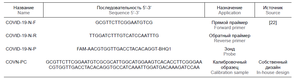 Для выявления вирусной РНК в реакции ОТПЦР-РВ были использованы праймеры и зонд к гену нуклеокапсида N вируса SARS-CoV-2: COVID-19- N-F, COVID-19-N-R, COVID-19-N-P (таблица) [22]. Для постановки реакции ОТ-ПЦР-РВ использовали набор реагентов «2,5× реакционная смесь для ПЦРРВ с Taq ДНК-полимеразой» и обратную транскриптазу MMLV («Синтол»). Реакционная смесь объёмом 25 мкл содержала по 10 пмоль каждого праймера и 5 пмоль зонда, Taq ДНК-полимеразу, 30 ед. обратной транскриптазы. Температурно-временной режим: 45ºС — 10 мин (1 цикл); 95ºС — 5 мин (1 цикл); 95ºС — 5 с, 55ºС — 45 с (45 циклов). Реакцию проводили в амплификаторе «DTprime» («ДНК-технология»). Все праймеры и зонды синтезированы в «Синтол». Для построения калибровочного графика использовали образцы, полученные в результате последовательных десятикратных разведений синтетического олигонуклеотида COVN-PC (таблица) с известной концентрацией.