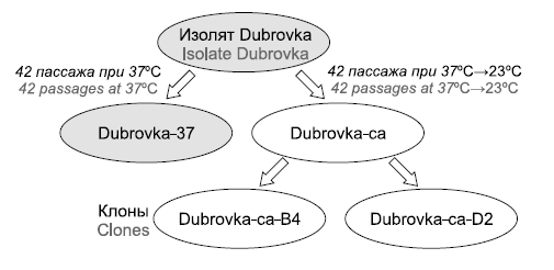С целью изучения адаптационных способностей SARS-CoV-2 проведено длительное пассирование штамма Dubrovka в культуре клеток Vero при постоянной температуре 37ºС или постепенно понижаемой до 23ºС температуре в течение 42 пассажей. Полученные варианты вируса были названы Dubrovka-37 и Dubrovka-са (cold-adapted) соответственно (рис. 1). Получение варианта Dubrovka-са проводили по следующей схеме: 10 пассажей при 37ºС, далее температуру культивирования понижали на 1ºС через каждые 2 пассажа, заключительные 6 пассажей проводили при 23ºС (всего 42 пассажа). Далее путём трёхкратного клонирования методом предельных разведений при 23ºС на основе варианта Dubrovka-са были получены два клона — B4 и D2 (далее — варианты Dubrovka-са-B4 и Dubrovkaса-D2).