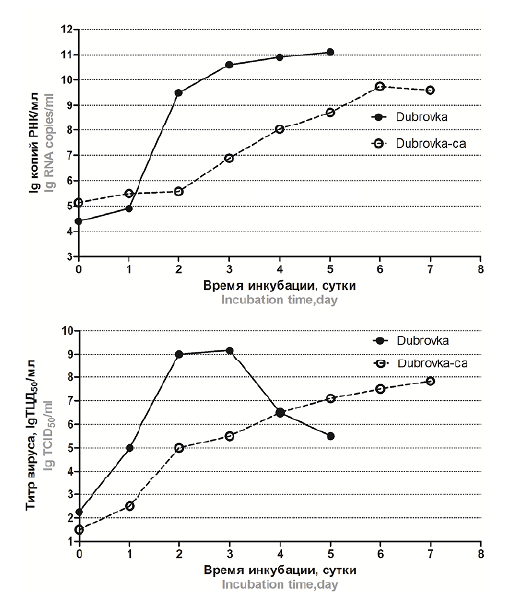 Варианты Dubrovka-37, Dubrovka-са-B4, адаптированные на протяжении более 40 пассажей к культуре клеток почки обезьяны Vero, утратили способность размножаться в культуре клеток рака лёгких человека Calu-3. Вариант Dubrovka-са-D2 в клетках Calu-3 размножался, но значительно медленнее штамма Dubrovka (рис. 7).