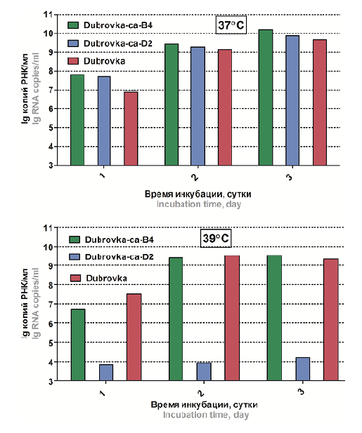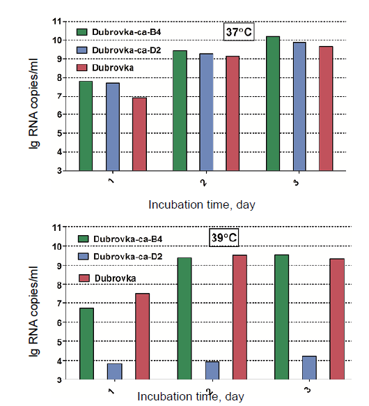 Рис. 5. Накопление вирусной РНК в культуре клеток Vero при заражении штаммом Dubrovka и вариантами Dubrovka-са-B4 и Dubrovka-са-D2 при температуре культивирования 37ºС или 39ºС.Клетки заражали при MOI = 0,001, ежедневно отбирали образец культуральной жидкости и определяли концентрацию вирусной РНК. Приведены средние значения по результатам 2 независимых экспериментов.