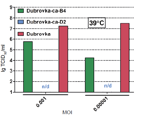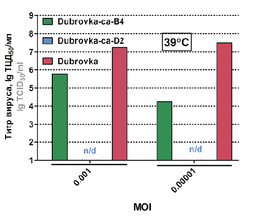 Рис. 6. Титр вируса на 3-и сутки после инфицирования культуры клеток Vero штаммом Dubrovka и вариантами Dubrovka-са-B4 и Dubrovka-са-D2 при температуре культивирования 39ºС и разной MOI.Клетки заражали вариантами вируса и через 72 ч определяли титр вируса в культуральной жидкости. Приведены средние значения по результатам 2 независимых экспериментов. n/d — не обнаружено.