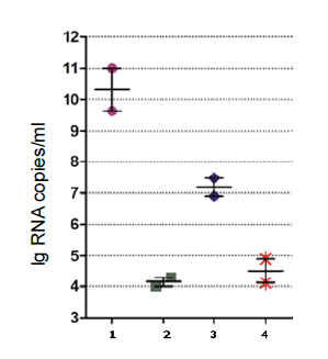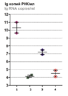 Рис. 7. Концентрация вирусной РНК в клетках Calu-3, заражённых вариантами SARS-CoV-2, на 3-и сутки после инфицирования при MOI 0,001.1 — штамм Dubrovka (2-й пассаж); 2 — Dubrovka-са-B4; 3 — Dubrovka-ca-D2; 4 — Dubrovka-37. Приведены средние значения по результатам 2 независимых экспериментов.