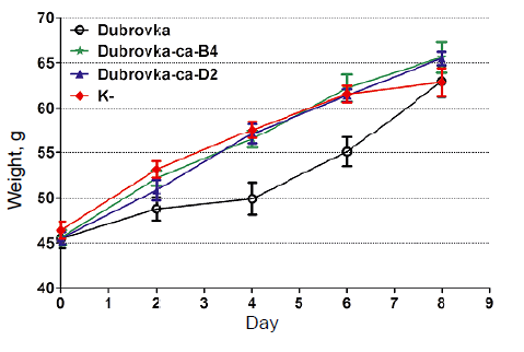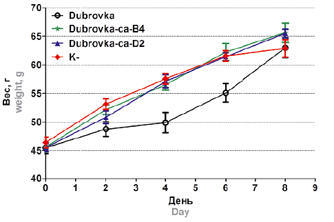 Рис. 8. Кинетика массы тела хомяков, заражённых интраназально штаммом Dubrovka и вариантами Dubrovkaса-B4 и Dubrovka-са-D2.С 0-х по 4-е сутки — n = 9 на группу, с 6-х по 8-е сутки — n = 5 на группу. Доза заражения — 4,0 lg ТЦД50. К– — незараженные хомяки.