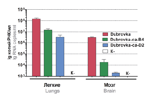 Рис. 9. Концентрация вирусной РНК в гомогенатах лёгких и мозга хомяков, заражённых интраназально штаммом Dubrovka и вариантами Dubrovka-са-B4 и Dubrovkaса-D2, на 4-е сутки после инфицирования.n = 4 на группу. К– — незаражённые хомяки.