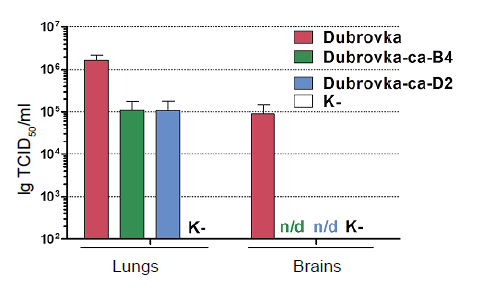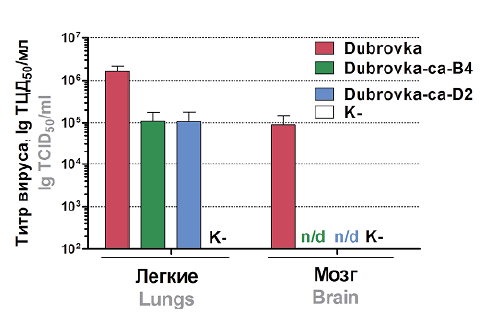 Титр вируса в гомогенатах лёгких животных на 4-е сутки после заражения ca-вариантами вируса составлял 5,0 lg ТЦД50/мл, что на 1,2 lg ниже, чем в контрольной группе (p < 0,05) (рис. 10). Инфекционный вирус в мозге на 4-е сутки после заражения ca-вариантами при титровании не обнаруживался, тогда как при заражении штаммом Dubrovka титр вируса в гомогенате мозга достигал 5,0 lg ТЦД50/мл (рис. 10). Важно отметить, что при титровании вируса гомогенаты органов в разведениях 1 : 10 и 1 : 100 были токсичными для клеток, что затрудняло учёт вирусного ЦПД и снижало чувствительность титрования.