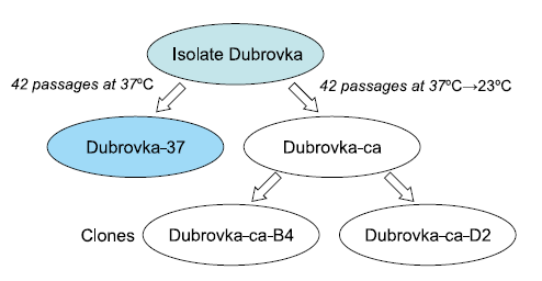 Для вариантов штамма Dubrovka: Dubrovka-37, Dubrovka-са, Dubrovka-са-B4 и Dubrovka-са-D2 были определены полногеномные последовательности (номера GenBank ON380441.1, ON040960.1, ON059701.1 и ON040961.1 соответственно). Первичный анализ геномов разных вариантов штамма Dubrovka выявил много нуклеотидных замен, большинство из которых были несинонимичными (приводили к аминокислотной замене). В геноме варианта Dubrovka-37 в результате длительной адаптации к культуре клеток Vero при 37ºС произошло 7 нуклеотидных замен, из которых 5 были несинонимичными. В геноме варианта Dubrovka-ca в результате холодовой адаптации в культуре клеток Vero произошло 17 нуклеотидных замен, из которых 16 замен были несинонимичными. Вместе с тем в геномах клонов ca-вариантов: Dubrovka-са-B4 и Dubrovka-са-D2 обнаружены 16 и 20 нуклеотидных замен, которые привели к 14 и 17 аминокислотным заменам соответственно. В гене S локализовано наибольшее число несинонимичных замен: 2 — в геноме Dubrovka-37, 5 — Dubrovka-ca, 6 — Dubrovka-са-B4, 7 — Dubrovka-са-D2. Примечательно, что в геноме варианта Dubrovka-са-D2, обладающего ts-фенотипом, из 20 нуклеотидных замен 11 являются уникальными по отношению к Dubrovka-37, Dubrovka-са и Dubrovka-са-B4; из них 9 приводят к аминокислотным заменам.