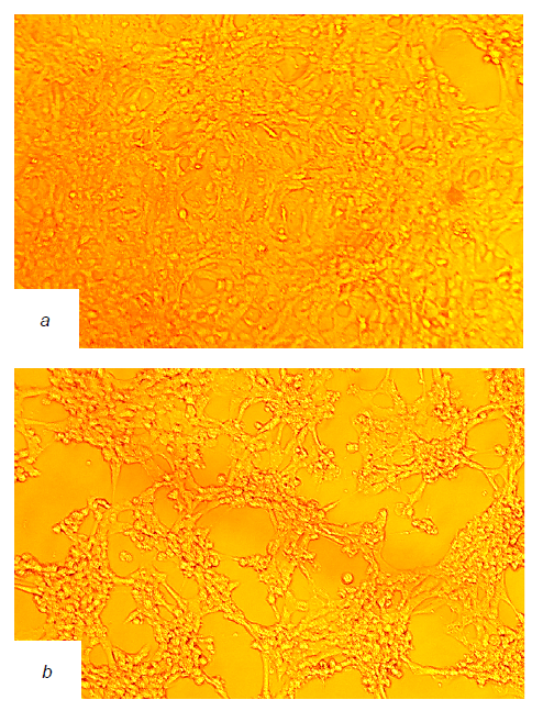 При пассировании в культуре клеток Vero при 37ºС титр вируса возрастал (от 4,3 lg ТЦД50/мл на 2-м пассаже до 9,0 lg ТЦД50/мл на 30-м пассаже), а ЦПД становилось все более выраженным. Если при заражении вирусом 2-го пассажа выживаемость клеток Vero на 5-е сутки после инфицирования составляла 92%, то уже к 14-му пассажу достигала минимального уровня (2–4%) [20]. Сроки проявления ЦПД в процессе холодовой адаптации изменялись с 2–3 сут при 37ºС до 5–7 сут после инфицирования при 23ºС. При заражении вариантом Dubrovka-са ЦПД проявлялось в нарушении целостности монослоя, появлении скоплений округлённых клеток без открепления клеток от поверхности флакона (рис. 2).