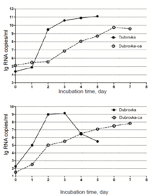 Вариант Dubrovka-са при 23ºС размножался значительно медленнее, чем родительский штамм Dubrovka при оптимальной для него температуре 37ºС. В связи с этим клетки заражали большей дозой варианта Dubrovka-са и проводили более длительную инкубацию. Если пик репродукции штамма Dubrovka (17 пассаж) при 37ºС (MOI 0,00001) приходился на 2-е сутки, достигая 9,0 lg ТЦД50/мл, то для варианта Dubrovka-са при 23ºС (MOI 0,001) — на 7-е сутки, достигая 8,0 lg ТЦД50/мл (рис. 3). Репродукция вируса сопровождалась накоплением в культуральной жидкости вирусной РНК (рис. 3).