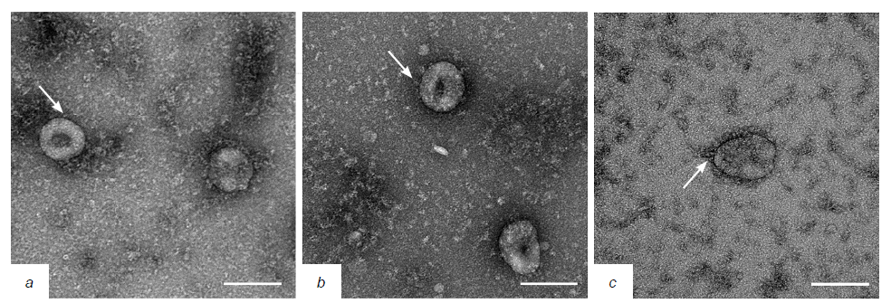 Рис. 4. Электронная микрофотография инактивированных УФ вариантов SARS-CoV-2. а — Dubrovka; б — Dubrovka-са-B4; в — Dubrovka-са-D2. ТЭМ. Негативное контрастирование 1% уранилацетатом.Стрелками отмечены тримеры S-белка на поверхности коронавируса. Масштабный отрезок — 100 нм.