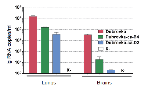 В лёгких и мозге животных на 4-е сутки после заражения ca-вариантами вируса концентрация вирусной РНК была достоверно более низкой по сравнению с контрольной группой, заражённой вирулентным штаммом Dubrovka (рис. 9). Наименьшая концентрация вирусной РНК в органах наблюдалась при заражении вариантом Dubrovka-са-D2: в лёгких — 6,5 lg копий РНК/мл, в мозге — 3,3 lg копий РНК/мл, что на 1,6 и 3,2 lg соответственно ниже, чем в контрольной группе (p < 0,05).