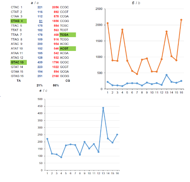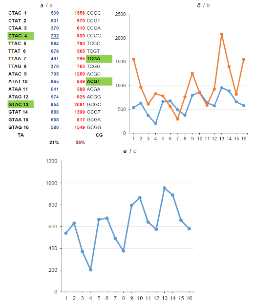Fig.3. Frequency profiles of nATn and nGCn tetra-nucleotides in DNA of Ranid herpesvirus 1. a — absolute values; 3’-trimers TAG and CGA are highlighted in green and bold; 5’-trimers CTA and CCG are underlined; below — the percentage ratio of complete tetramers: ACGT:TCGA and GTAC:CTAG; b, c — a graphic representation of absolute values; c — nTAn, vertical scale up
