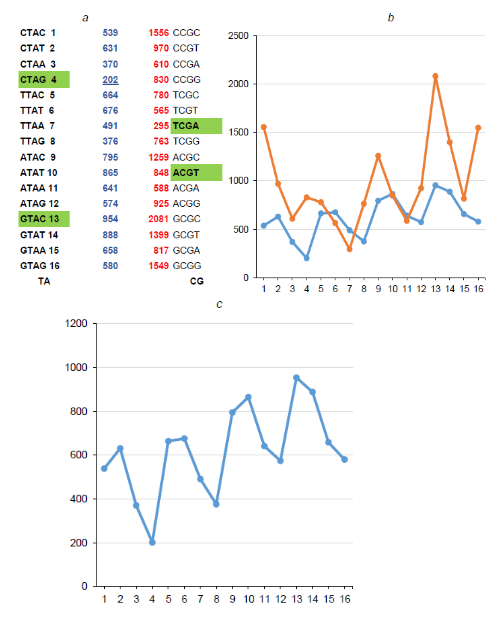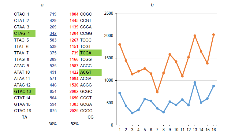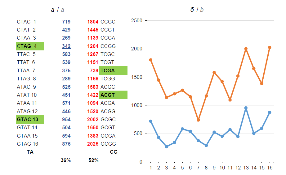 Fig. 2. Frequency profiles of nTAn (blue) and nCGn (red) tetra-nucleotides in the Human Cytomegalovirus (HHV5) DNA.a — absolute values; b — their graphic representation. The percentage ratio of symmetrical pairs of two complete tetramers, ACGT:TCGA and GTAC:CTAG (shown in green and in bold).