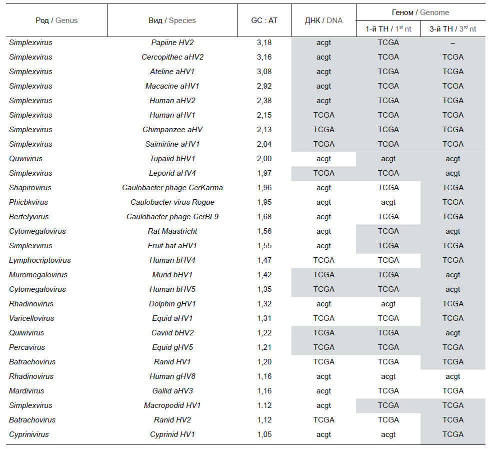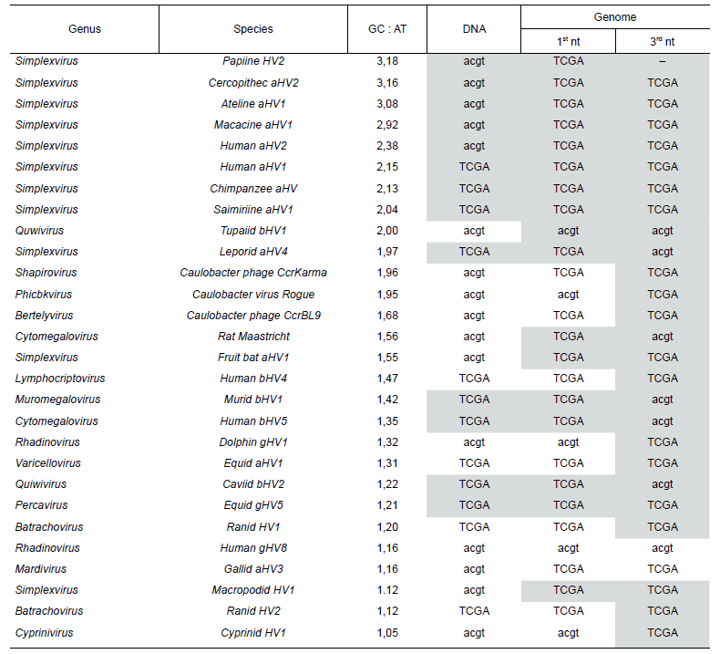 Characteristics of the 1st (A) and 3rd (G) lines of virus (mainly herpesvirus) genomes with ratio GC : AT > 1