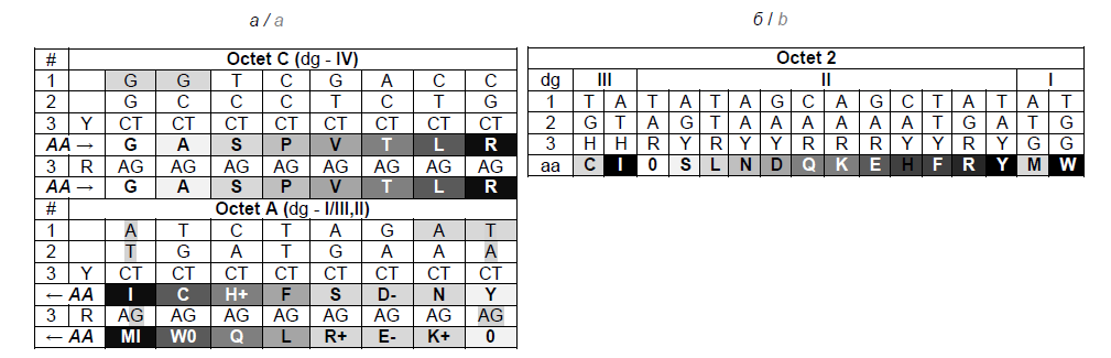 The genetic code owes the robustness of its structure mainly to the symmetry of its elements. Rumer’s table is one of the most illustrative examples of such symmetry (the first in the history) [22][23]; it was later converted by V. Scherbak into a calligram, with the symmetry between the first letters of coding triplets and the coding products arranged by their molecular weight [16]. This symmetrical relationship does not still have any clear explanation. In our slightly modified table (calligram A; Fig. 4, a), we placed an emphasis on the evolutionary stages of the code — as opposed to the established degeneracy groups in the original calligram. It shows the dominance of G+C in the first octet, which, apparently, reproduces the dominance of more thermally stable pairs G≡C in the “pre-code” set of polynucleotides, and A+T in the second octet, which is also responsible for gene reading and other features, thus being more complex and, most likely, evolutionary younger. In our version, octet 2 of the calligram (Fig. 4, b) is “packed tight” as the amino acid sequence is based on the total weight of products encoded by triplets with the third pyrimidine Y or purine R. This octet is referred to as octet A (Fig. 4, a) by the prevailing total content of nucleotides A in the 1st and 2nd coding lines. For the same reason, octet 1 of the calligram is referred as octet C. The number of all four nucleotides in the first lines of each octet is identical, thus emphasizing the inter-octet symmetry.
