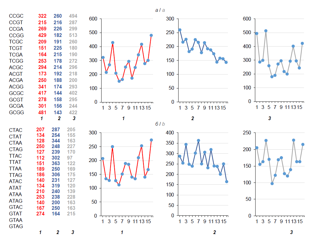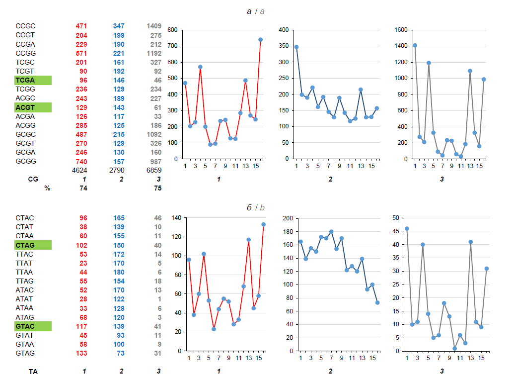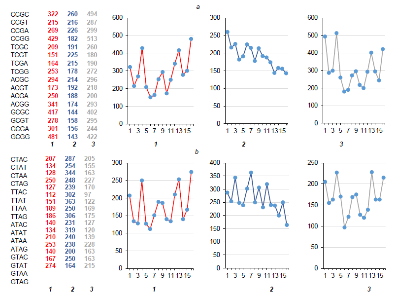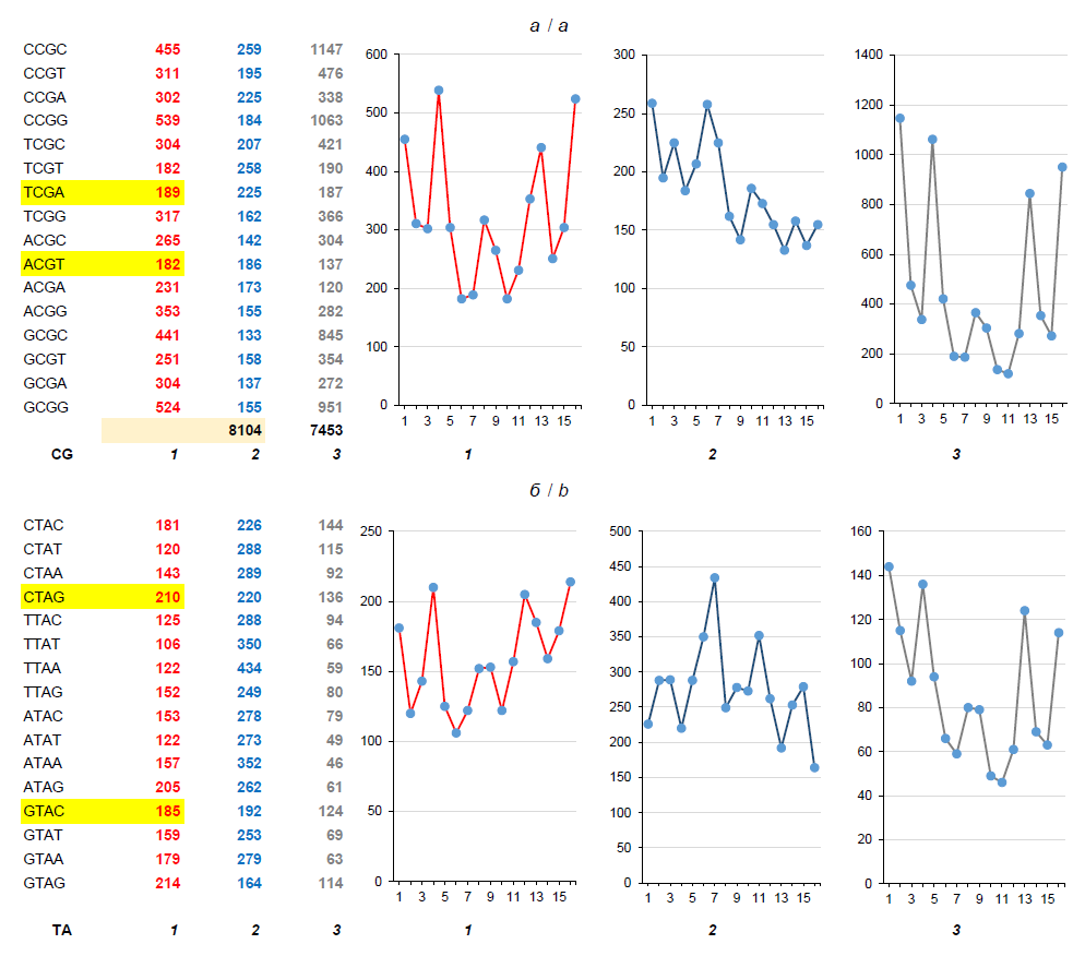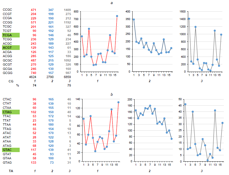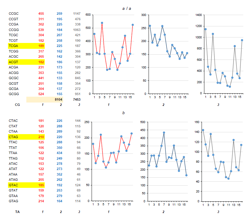 Fig. 5. FPs of nCGn (a) and nTAn (b) tetramers in chains of the 1st, 2nd and 3rd nucleotides of the Herpes simplex virus 1 genome.Here and in Fig. 6, 7: on the left — absolute values, on the right — their graphic representation in chains of the 1st, 2nd and 3rd nucleotides to demonstrate proportions of the profile (but not its scale, which can be estimated with the help of absolute values presented in the numeric section of the figure).