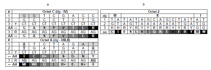 Fig. 4. Calligram A of the universal genetic code (a) and octet 2 of the calligram of the universal genetic code ([16]; b).The third nucleotide of the codon is represented by purine (R) or pyrimidine (Y). The start codon ATG and the stop codon TAR are highlighted vertically in grey. The first letters of central tetra-nucleotide codons of each octet are shown in bold. The tetra-nucleotide of the junction of octets A and C is also highlighted in grey. The successive increase in the molecular weight of the coding products (AC, amino acids) is shown by the increasing background density from white to black and by arrows. Roman numerals are used to denote degeneracy groups of the code, dg. Three pairs of coding products, some of which can bear a charge (that is why their positions in the lines are not stable and fixed following the dominant rule — the symmetry of the first letters of codons), highlighted in light grey