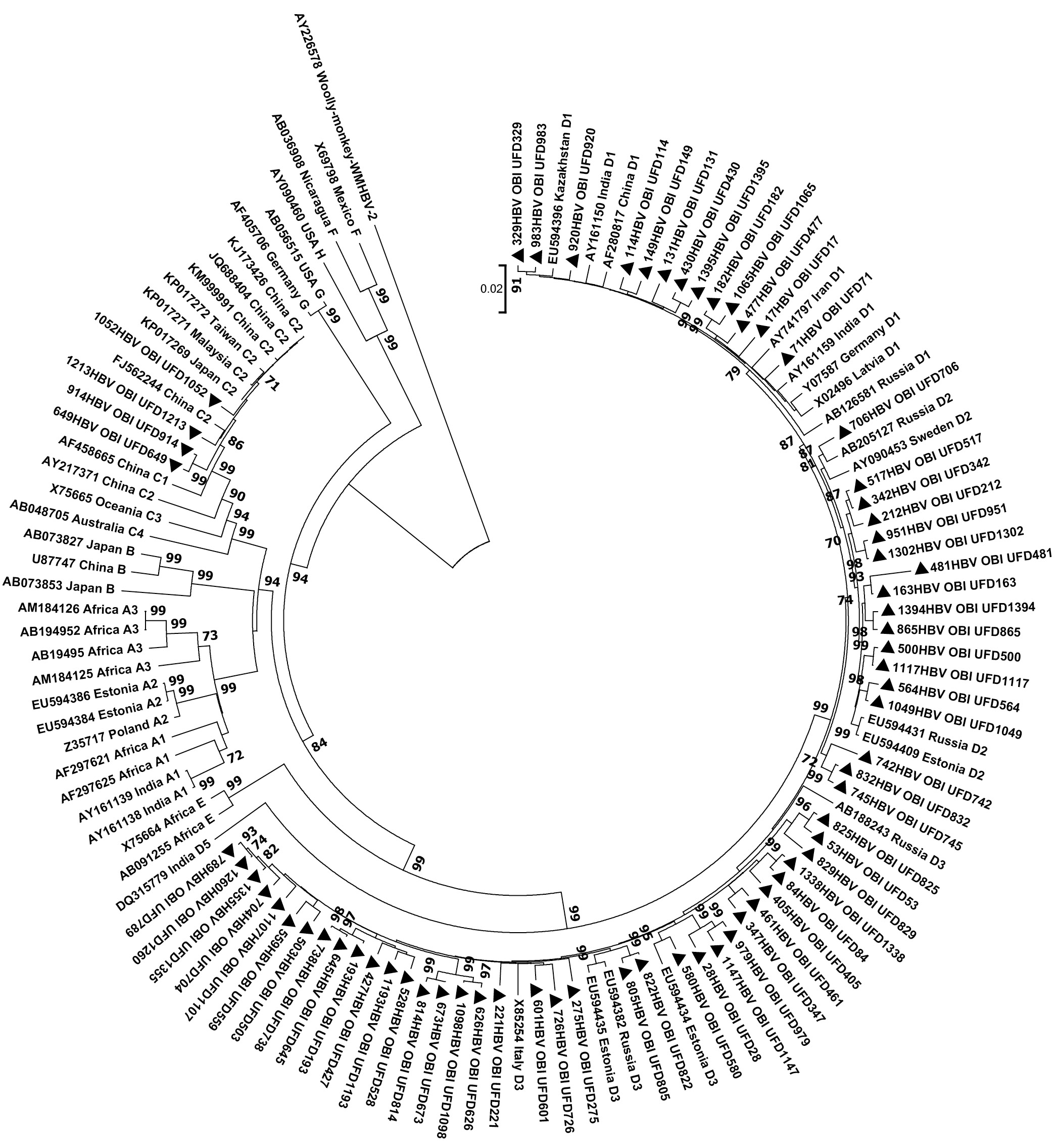 Phylogenetic analysis of the HBV complete genomic nucleotide sequences from blood donors compared to reference sequences from the GenBank international database. The reference sequences have the assigned GenBank codes showing the genotype and the region of the sample. Nucleotide sequence AY226578 of woolly monkey HBV was used as an out-group. The studied samples are marked with black triangles. The phylogenetic tree was constructed using the neighbor-joining method. Bootstrap values ≥ 60 are used.