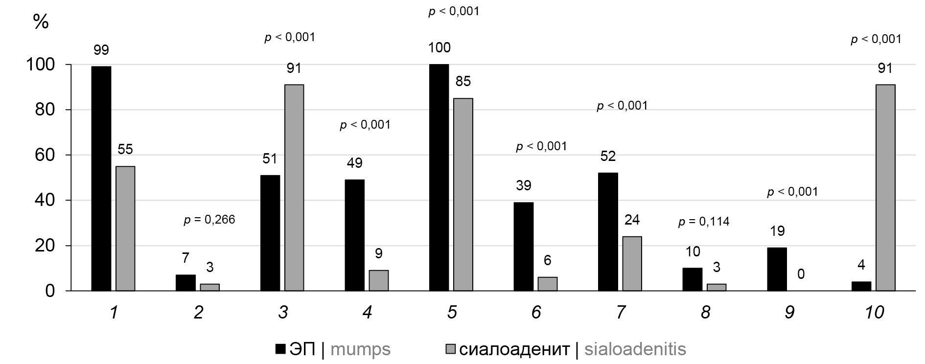 1 — weakness; 2 — headache; 3 — swelling of one salivary gland; 4 — swelling of both salivary glands; 5 — pain in the parotid region; 6 — dry mouth; 7 — febrile temperature; 8 — abdominal pain; 9 — orchitis; 10 — catarrhal upper respiratory tract phenomena.