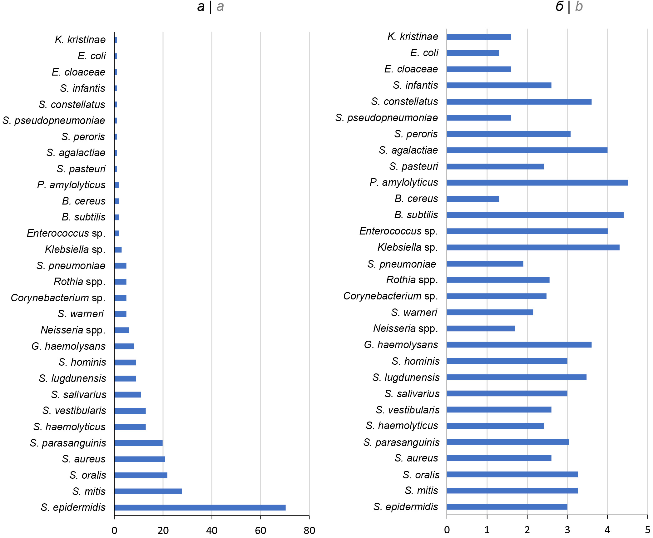 В табл. 1 указаны виды условно-патогенных бактерий, выделенных из 100 образцов ГМ: 270 изолятов представлены 36 видами 13 родов. Преобладающими являются стафилококки (7 видов) и стрептококки (11 видов). Наиболее часто (свыше 20%) встречаются стафилококки — S. epidermidis, S. aureus и стрептококки — S. mitis и S. oralis (рисунок, а). Остальные роды бактерий представлены 1–3 видами, причём некоторые из полученных изолятов, такие как Enterococcus sр., Corynebacterium sp., Rothia sp., Neisseria sp. и Gemella sp., не удалось идентифицировать до уровня вида, даже применив такой современный метод, как MALDI-TOF масс-спектрометрия. Обращает на себя внимание тот факт, что обсеменённость ГМ стафилококками и стрептококками варьировала от 102 до 103 КОЕ/мл, тогда как максимальная биомасса бактерий (104 КОЕ/мл и выше) характерна для редко встречающихся видов, таких как P. amylolyticus, B. subtilis и др. (рисунок, б).