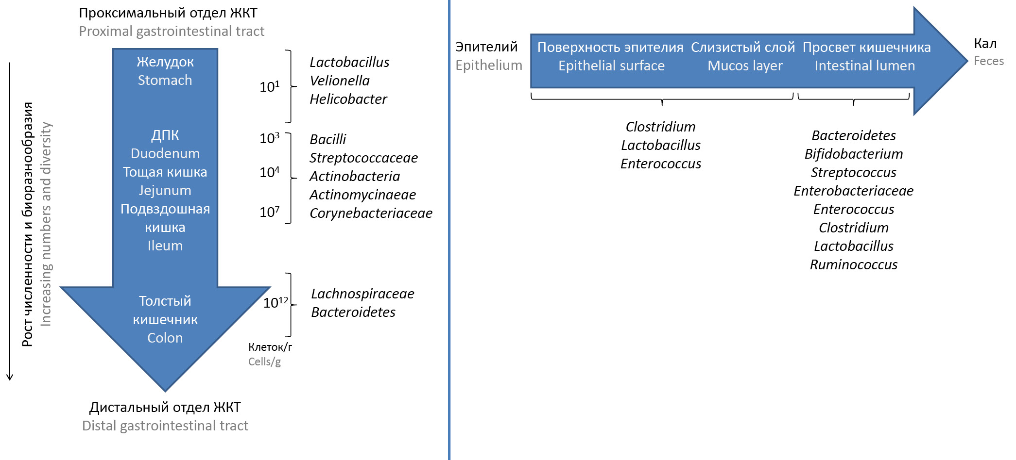 Микробиом ЖКТ человека — это большое, сложное, динамичное микробное сообщество, состоящее из 1014 микроорганизмов более чем 1000 видов, что эквивалентно 4 × 106 генам [1]. В ЖКТ человека чаще всего встречаются Firmicutes (≈ 51%) и Bacteroidetes (≈ 48%), далее следуют представители других типов бактерий, включая Actinobacteria, Cyanobacteria, Fusobacteria, Proteobacteria и Verrucomicrobia [2, 3]. В дистальных отделах ЖКТ увеличивается численность микробиоты, она становится более разнообразной (рис. 1).