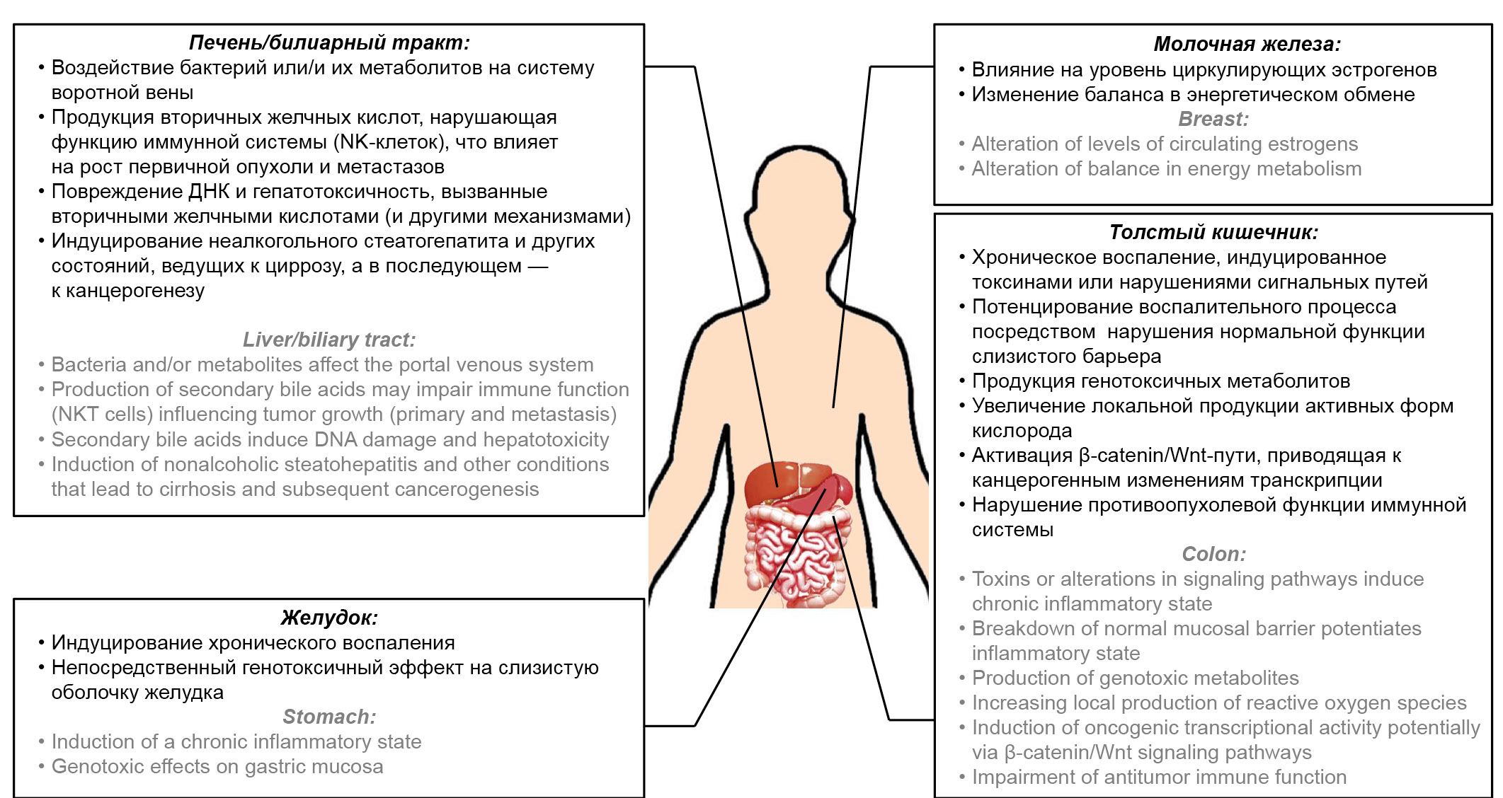 К настоящему времени наиболее изучены связи микробиоты ЖКТ и опухолей пищевода, желудка и кишечника, однако существуют данные, свидетельствующие о том, что микробиота ЖКТ может влиять на канцерогенез и в других органах. Несмотря на то что микробиота других органов представляет собой значительно меньшую биомассу, она также может воздействовать на развитие опухолей посредством модуляции физиологических и биохимических процессов, а также взаимодействия с кишечной микробиотой.
