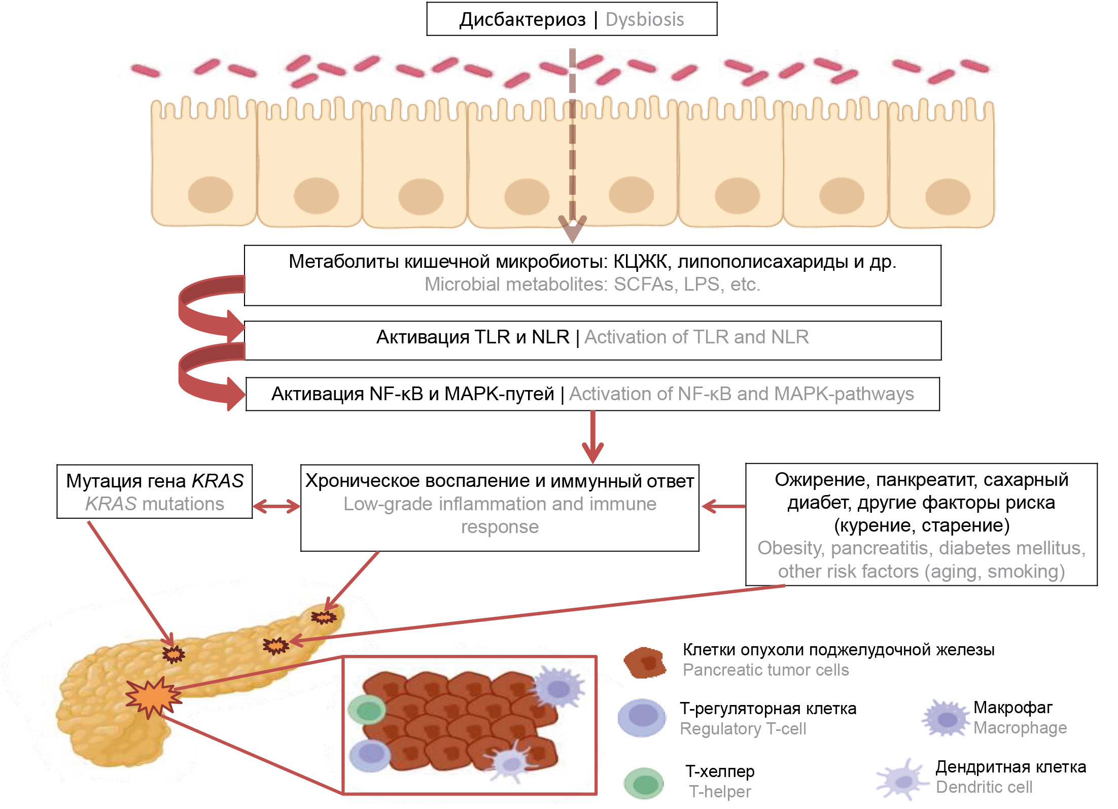 Активация Toll-подобных и Nod-подобных рецепторов микробными молекулярными паттернами поддерживает хроническое воспаление поджелудочной железы и вызывает активацию сигнальных путей NF-κB и MAPK, что способствует развитию панкреатита и канцерогенезу [37]. Механизмы, посредством которых кишечная микробиота влияет на развитие рака поджелудочной железы, представлены на рис. 3.