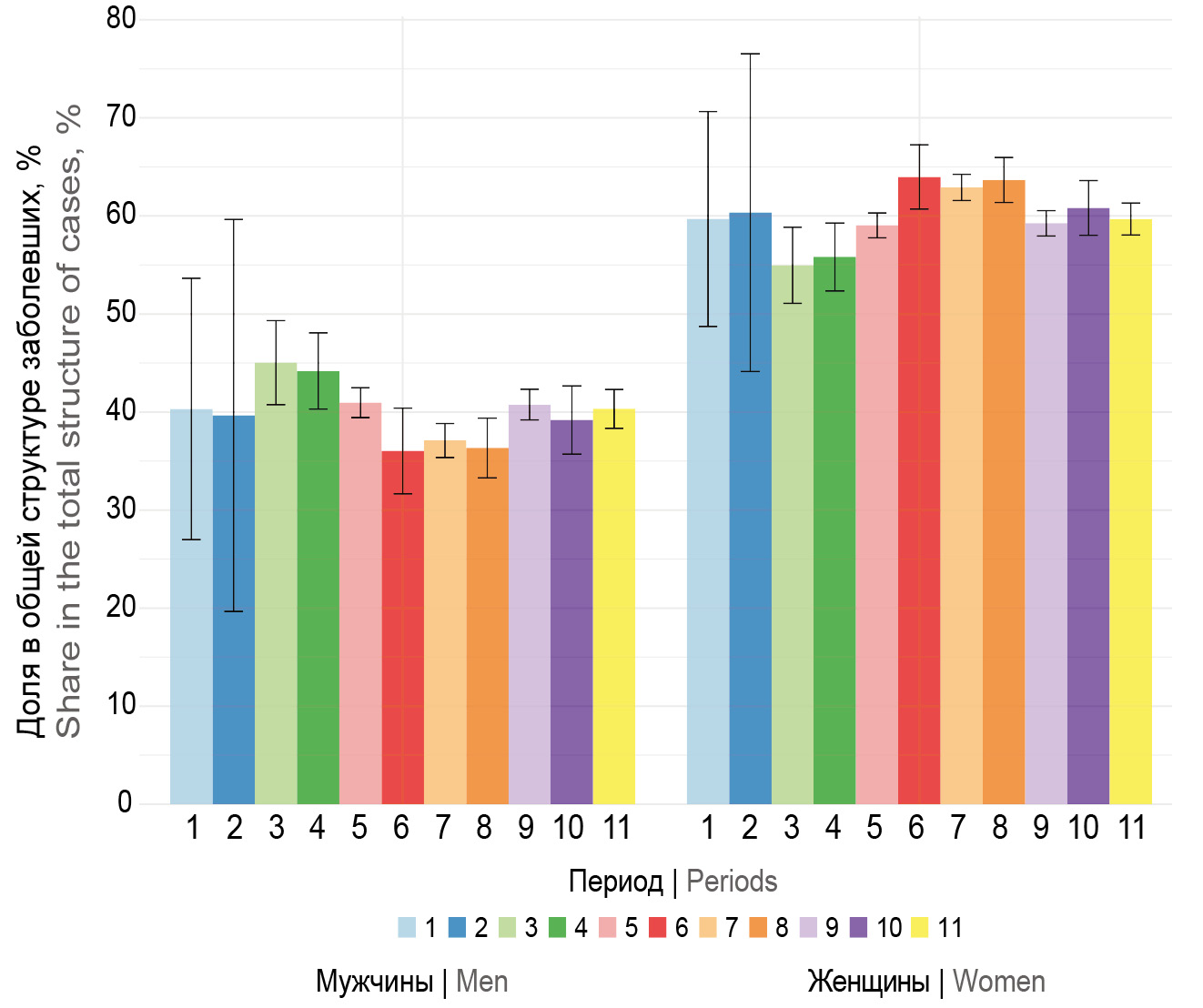 Для анализа половозрастной структуры заболевших COVID-19 использовали истории болезни пациентов, давших информированное согласие, составленные в различные периоды наблюдения на базе медицинских учреждений Москвы: Инфекционной клинической больницы № 1 ДЗМ, Городской клинической больницы № 67 ДЗМ. Исследование проводилось при добровольном информированном согласии пациентов. Протокол исследования одобрен локальным этическим комитетом Национального научно-исследовательского института эпидемиологии и микробиологии им. Н.Ф. Гамалеи (протокол № 14 от 29.09.2021).