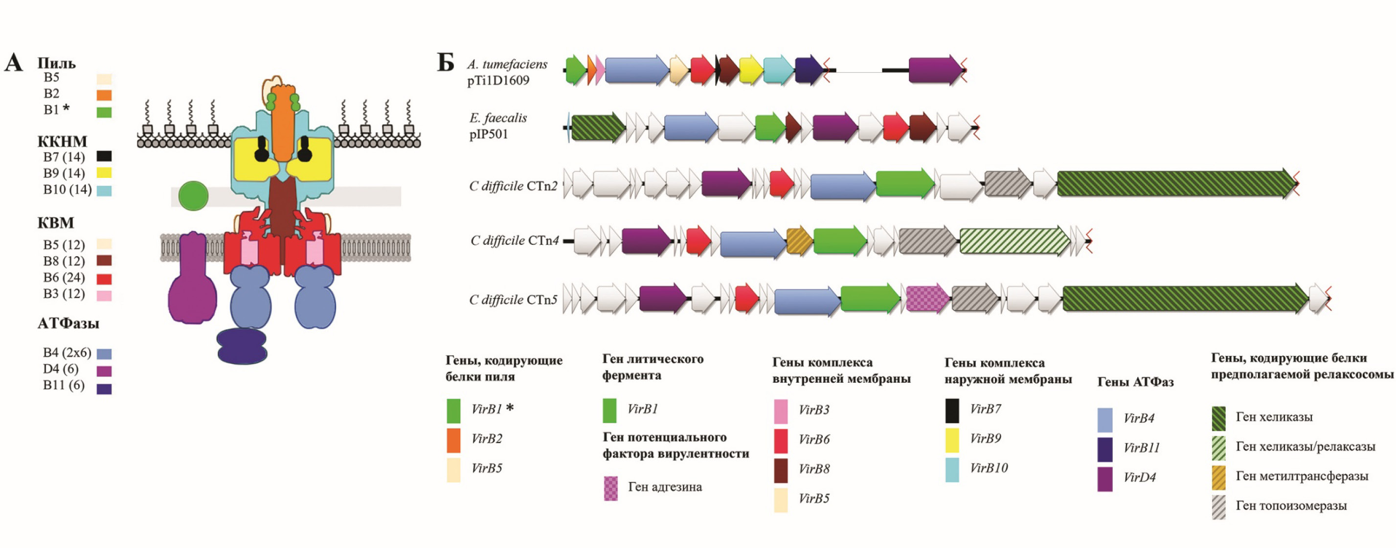 a — schematic representation of the Agrobacterium tumefaciens type 4A secretion machinery [25]; b — T4SS-C components of three conjugative transposons of C. difficile strain 630 compared to representatives of T4SS-A (A. tumefaciens pTi1D1609) and T4SS-C (Enterococcus faecalis pIP501).