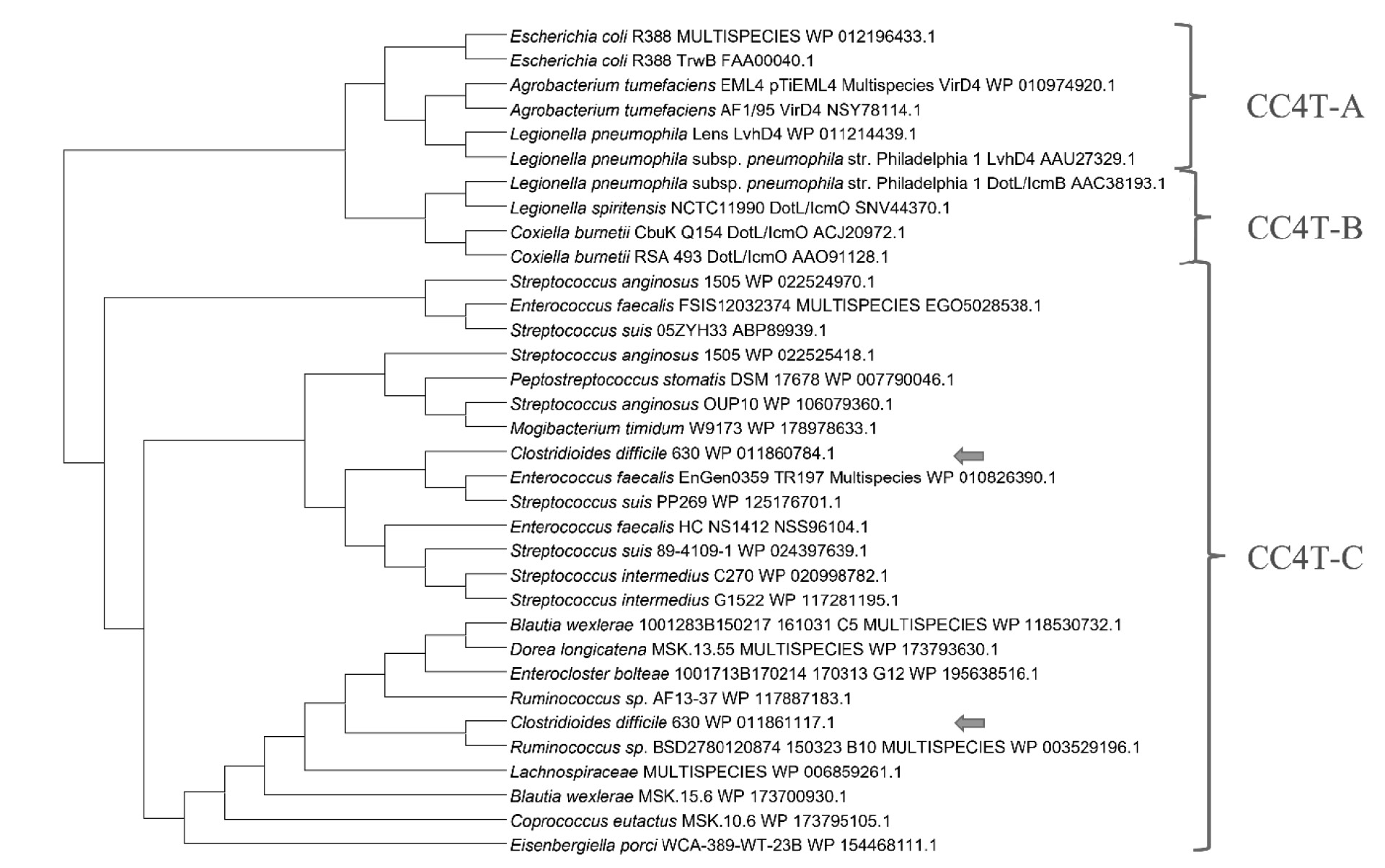 VirB4 and VirD4 proteins are the most important components of bacterial T4SS; they take part in translocation as an energy source for transport of biomolecules. Both ATPases belong to conserved proteins of the secretion machinery [58, 59] and, consequently, are the best targets for taxonomic studies [60]. The phylogenetic analysis of sequences of VirB4 and VirD4-like ATPases makes it possible to identify which class (A, B, or C) T4SS including the above enzymes should be assigned to (Fig. 2). Because of the differences in their structure, C. difficile VirB4 and VirD4 of transposons CTn4 and CTn2/CTn5 fall into different clades, which, together with ATPases of the pathogenicity island of S. suis constitute three taxonomically important groups within T4SS-C, thus implying that their functional significance can be different.