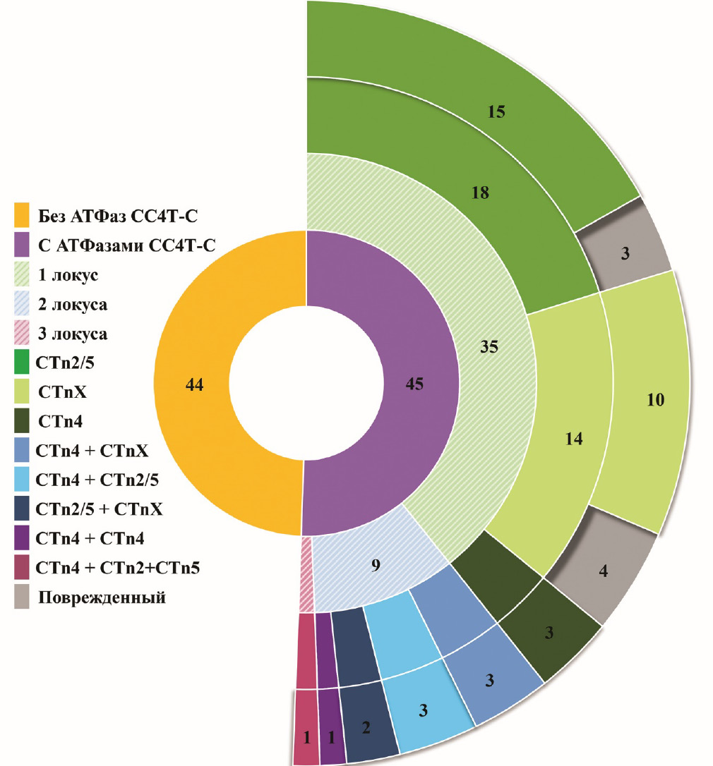 In genomes, ATPases could be present in 1 (1 locus), 2 (2 loci), or 3 (3 loci) variants. If amino acid sequences were more than 87% identical to WP_011861117.1 (VirD4Ctn4) and WP_011861114.1 (VirB4Ctn4), we assigned them to the CTn4 group. If both sequences were more than 87% identical to WP_011860784.1 (VirD4Ctn2/5) and WP_042741540.1 (VirB4Ctn2/5), they were assigned to the CTn2/5 group. At lower values, ATPases were assigned to the CTnX group. The amino acid sequences lacking Walker A or Walker B motifs, which participate in the formation of oligomeric complexes and constitute the active center of the enzyme, were seen as damaged.