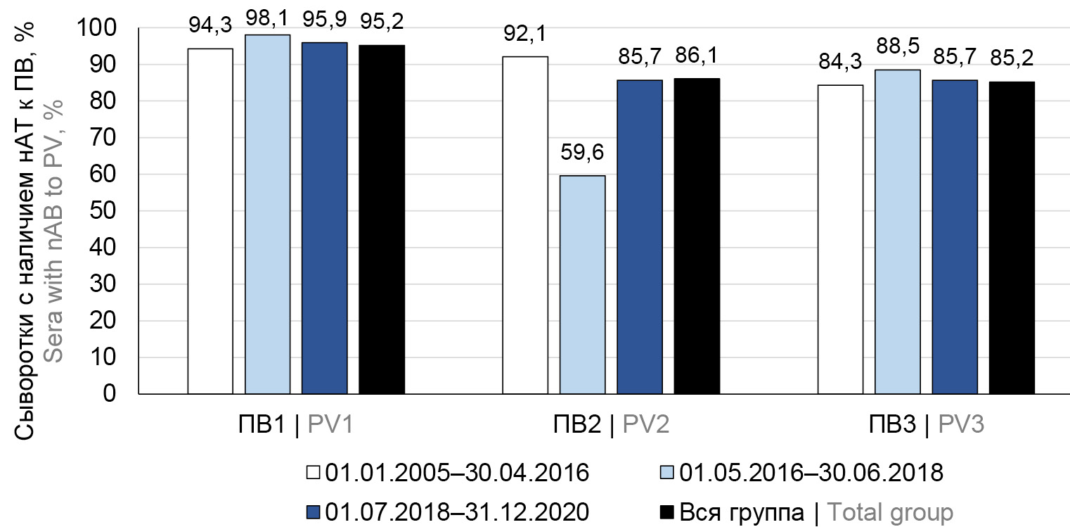 In general, less than 95% of the examined patients had nABs to PV: 94.4% to PV1, 86.1% to PV2, 83.6% to PV3; 3.3% did not have antibodies to all three types of PV. The level of herd immunity varied in the examined groups depending on the vaccination schedule and the composition of the poliovirus vaccines used: nABs to PV2 had 59.6% of children born during the period when vaccines containing PV2 were not used, and 85.7% of children born after the introduction of trivalent IPV. Deficiency in immunity to PV2 was the cause of a polio outbreak in 2021 caused by circulating vaccine-derived PV type 2.