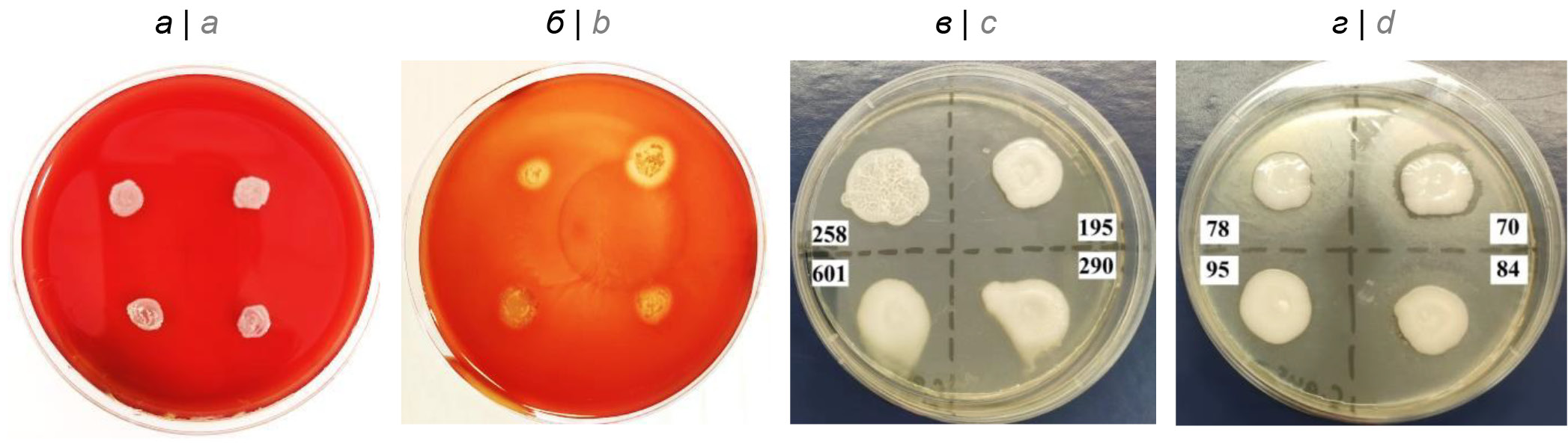 Рис. 1. Гемолитическая (a, б) и липазная (в, г) активность C. albicans и C. auris. a — рост C. albicans на кровяном агаре — гемолиза нет; б — гемолиз вокруг колоний C. auris на кровяном агаре; в — рост C. albicans на агаре, содержащем Твин-20; г — матовые ореолы вокруг колоний C. аuris на агаре, содержащем Твин-20. / Fig. 1. Hemolytic (a, b) and lipase (c, d) activity of C. albicans and C. auris. a — C. albicans growth on blood agar without hemolysis; b — hemolysis around the colonies of C. auris on blood agar; c — C. albicans growth on Тween-20 agar; d — matte halos around the colonies of C. auris on Тween-20 agar.