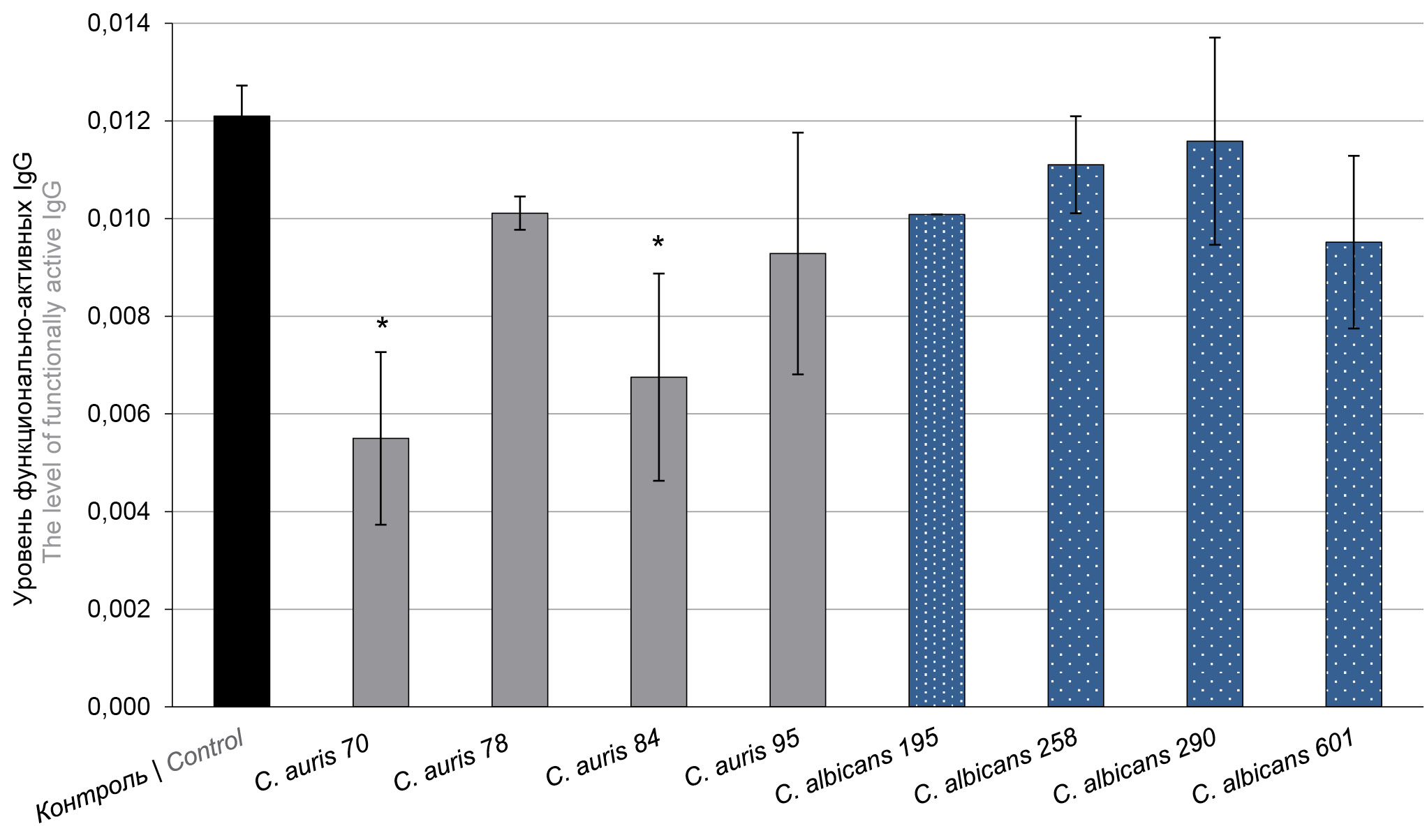Рис. 2. Концентрация функционально активных IgG после часовой экспозиции с метаболитами кандид. *р < 0,05 по сравнению с контролем. / Fig. 2. Сoncentration of functionally active IgG after one-hour exposition with Candida metabolites. *p < 0.05 compared to control.
