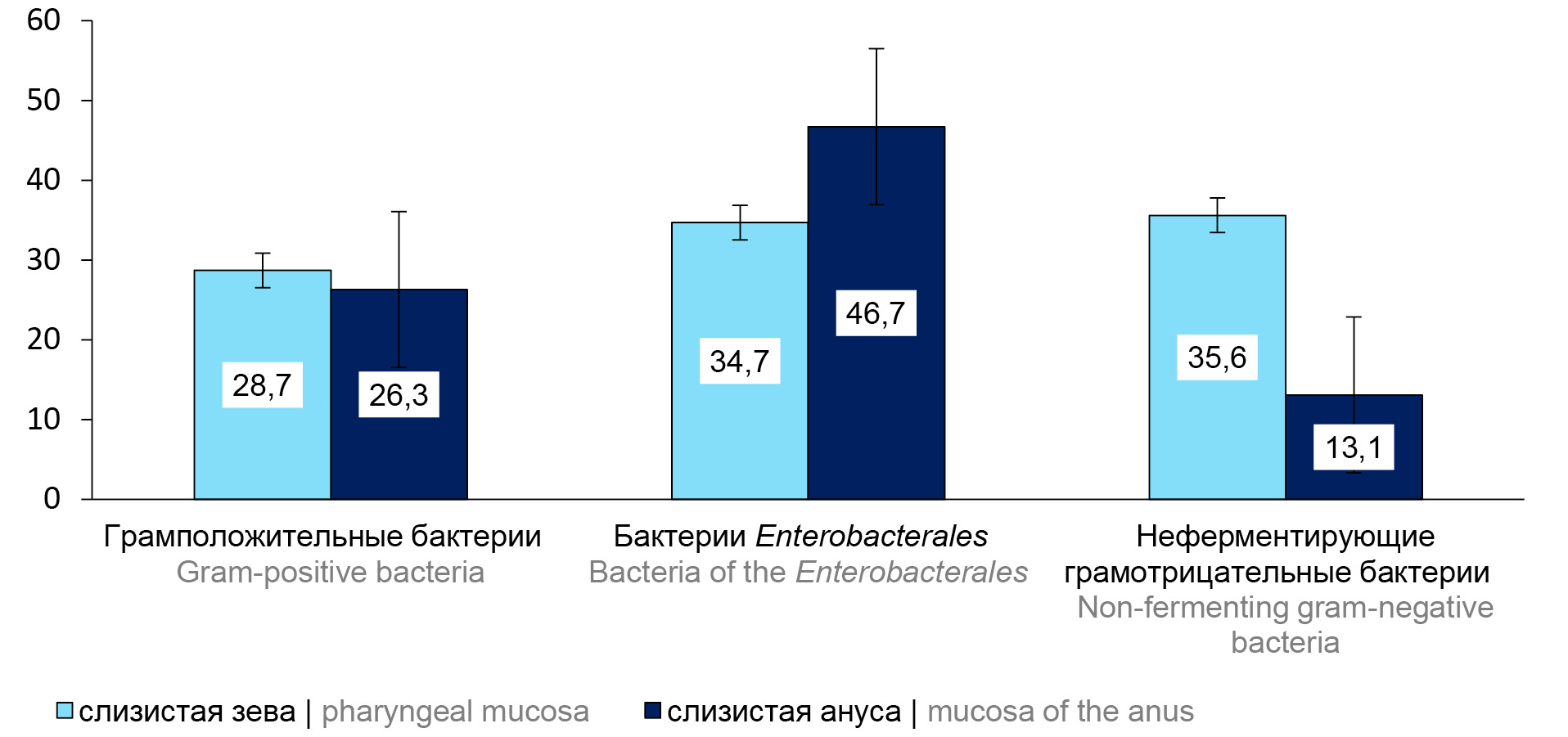 The results of the bacteriological studies of the children’s oral and anal mucosa show that the obtained isolates are represented by gram-positive and gram-negative bacteria as well as by the minor quantity of fungi of the genus Candida. The group of gram-positive bacteria (27.3% [95% CI, 21.7–33.4]) was comprised by bacteria of the genera Staphylococcus (S. aureus and other species), Streptococcus (primarily S. vestibularis, S. salivarius) and Enterococcus faecalis. Gram-negative isolates are represented by Enterobacterales bacteria (41.6% [95% CI, 35.3–48.1]) and nonfermenting gram-negative bacteria (22.7% [95% CI, 17.5–28.5]). Among representatives of Enterobacterales, we identified bacteria of the following genera: Escherichia, Klebsiella, Serratia, Enterobacter; the cluster of nonfermenting gram-negative bacteria was comprised by Acinetobacter spp., Pseudomonas spp., Stenotrophomonas maltophilia and Elizabethkingia meningoseptica. The isolates from the studied loci demonstrated the dominance of Enterobacterales bacteria. Fungi of the genus Candida accounted for 8.4% [95% CI, 5.2–12.7].