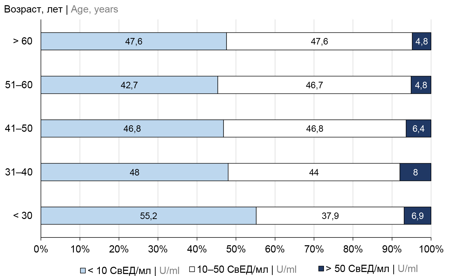 Высокий процент серонегативных лиц (55,2%) наблюдался среди МР моложе 30 лет, в более старших возрастных группах доля МР, не имеющих антител, варьировала от 42,7 до 48,0% (рисунок). Медианы концентрации антител не различались в зависимости от занимаемой должности (p = 0,87) и стажа работы (p = 0,89).