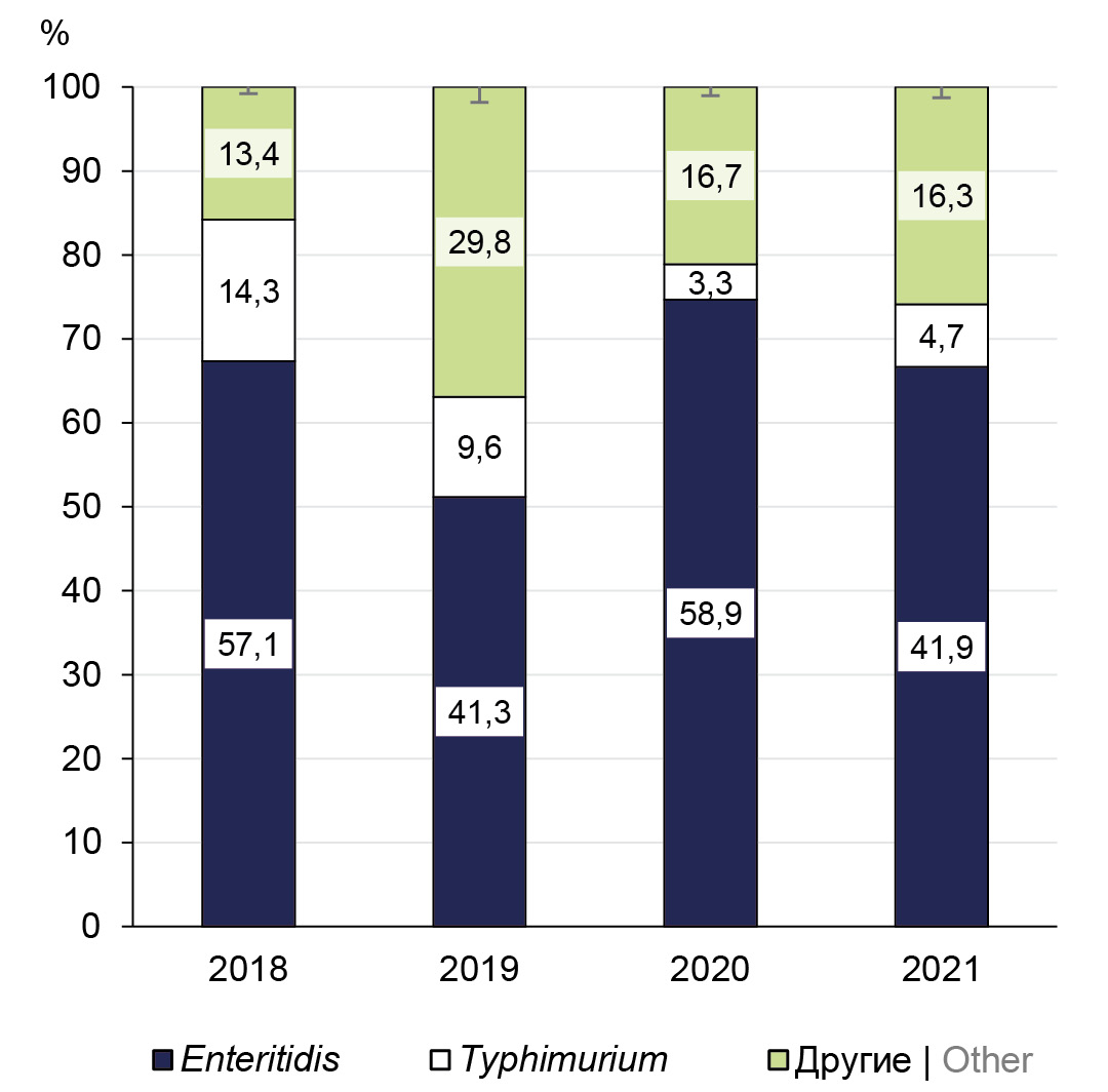 We studied Salmonella enterica cultures isolated from different food products in Belarus in 2018–2021 for the further assessment of their susceptibility to antibiotics. Our findings showed that pork and poultry products, including processed products, were the most frequent sources of Salmonella. Speaking about poultry products, we should note that the prevalence of resistant Salmonella increased significantly during the period of studies — from 19.8% in 2018 to 65.1% in 2021. The prevalence of Salmonella primarily in pork, chicken and turkey products was comparable with the rates reported by the United States, Egypt and Columbia [12–14]. Throughout the period of studies, the prevailing serotypes were Enteritidis (50.8%) and Typhimurium (9.0%). The dominance of these serotypes in meat products was also reported by researchers from India and Saudi Arabia, where serotypes Enteritidis and Typhimurium accounted for more than 95% of isolates [3, 11]. According to the European Union One Health Zoonoses Report (2020), serotype Enteritidis also dominated in the European Region [15].