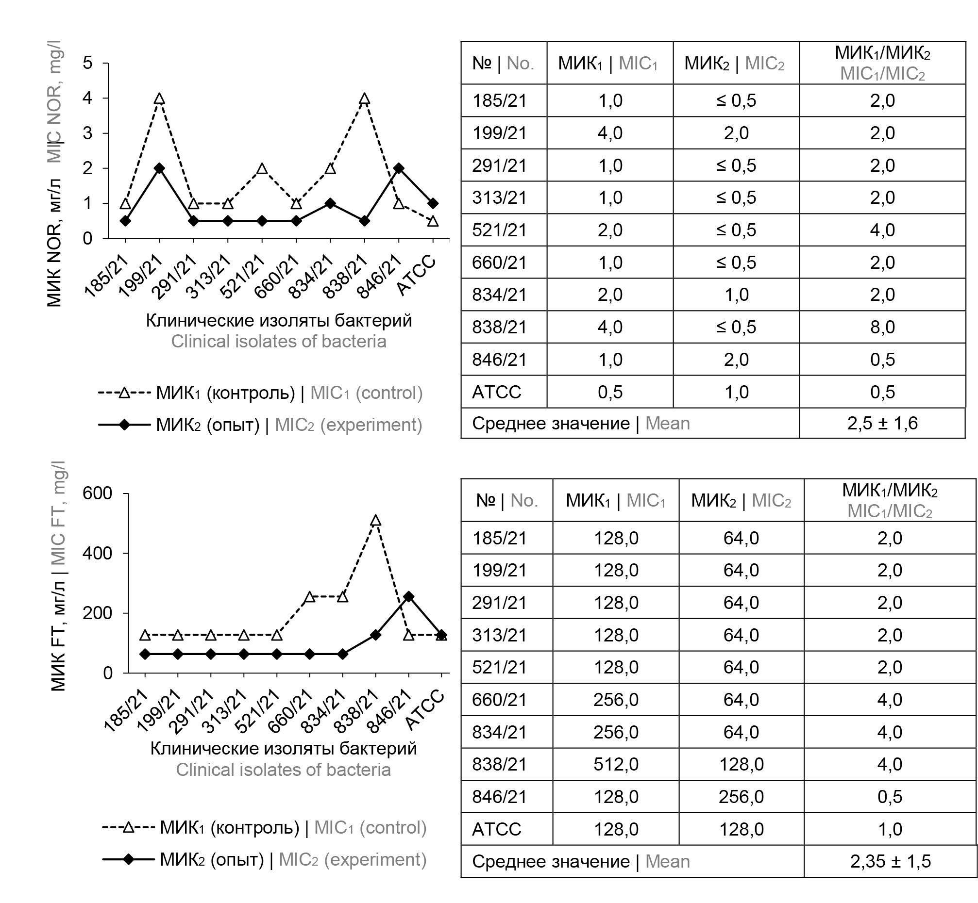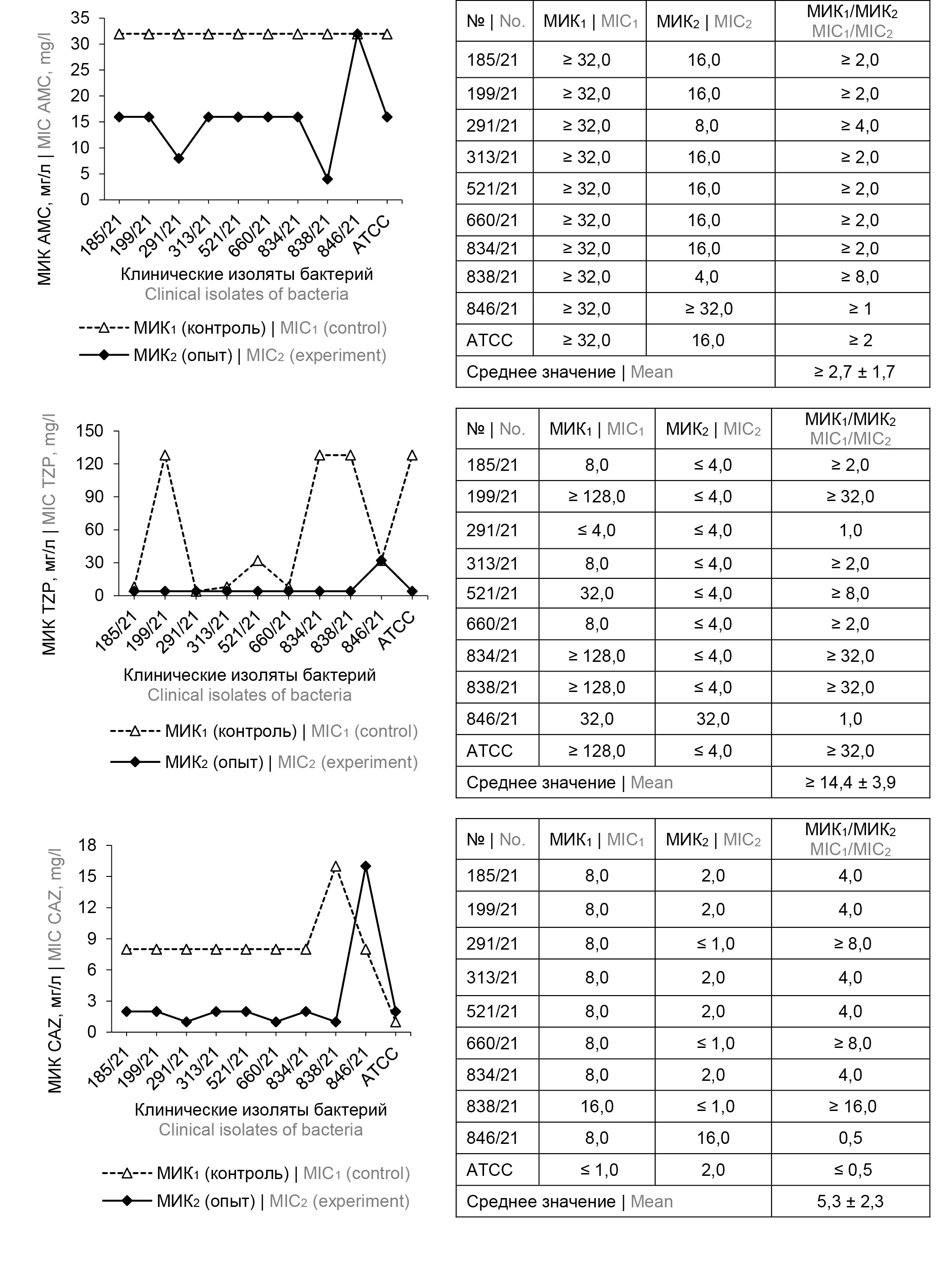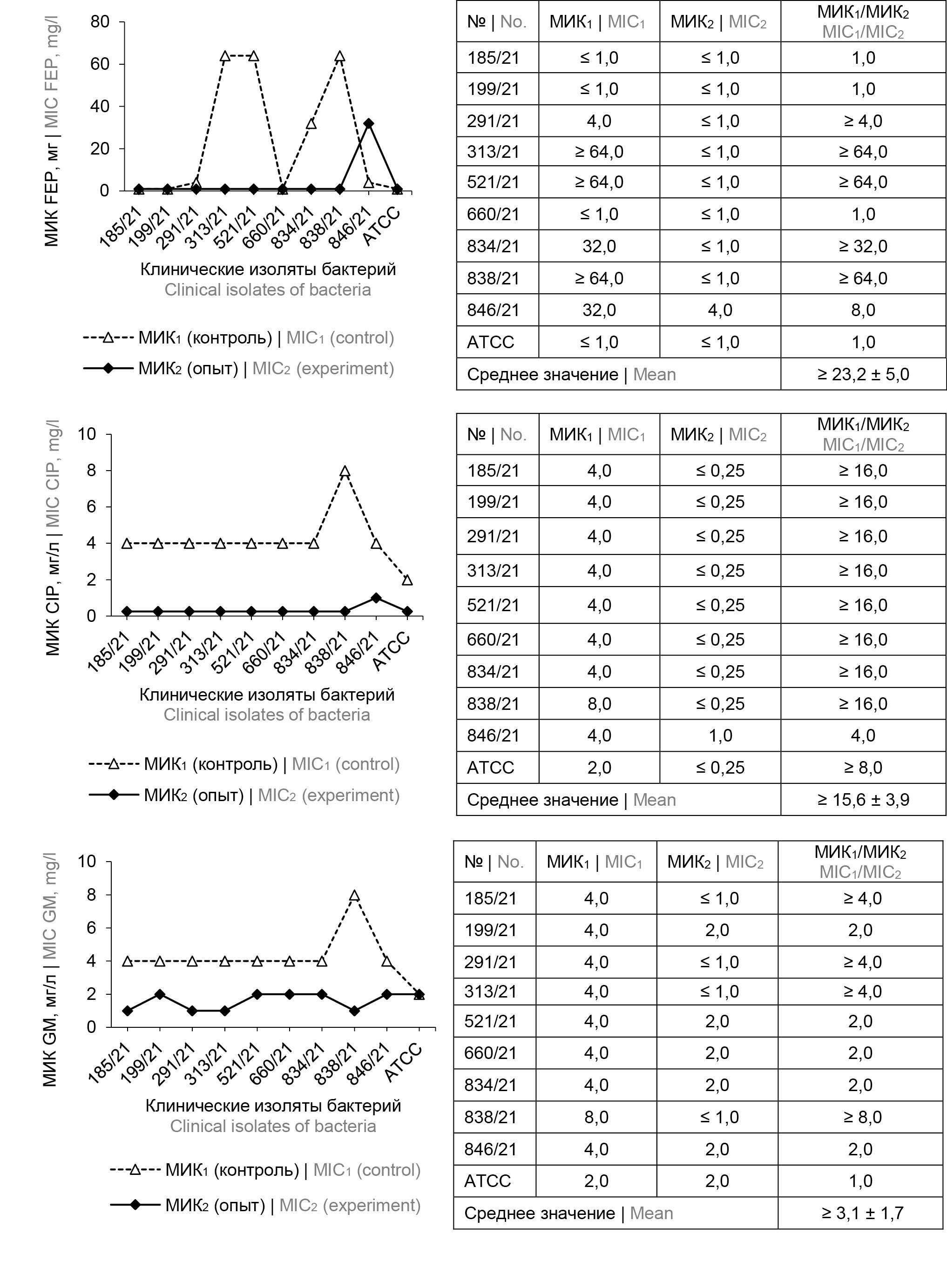 МИК антибиотиков в отношении изученных культур снизились в среднем в 2,35–23,2 раза по сравнению с контрольными значениями. В условиях опыта чувствительность изученных культур возросла к амоксициллин/клавулановой кислоте в ≥ 2 – ≥ 8 раз, пиперациллин/тазобактаму — в ≥ 2 – ≥ 32 раза, цефтазидиму — в 4 – ≥ 16 раз, амикацину — в 2 – ≥ 16 раз, эртапенему — в 2–8 раз, меропинему — в 2–8 раз, цефепиму — в ≥ 4 – ≥ 64 раз, ципрофлоксацину — в 4 – ≥ 16 раз, гентамицину — в 2 – ≥ 8 раз, норфлоксацину — в 2–8 раз, нитрофурантоину — в 2–4 раза.