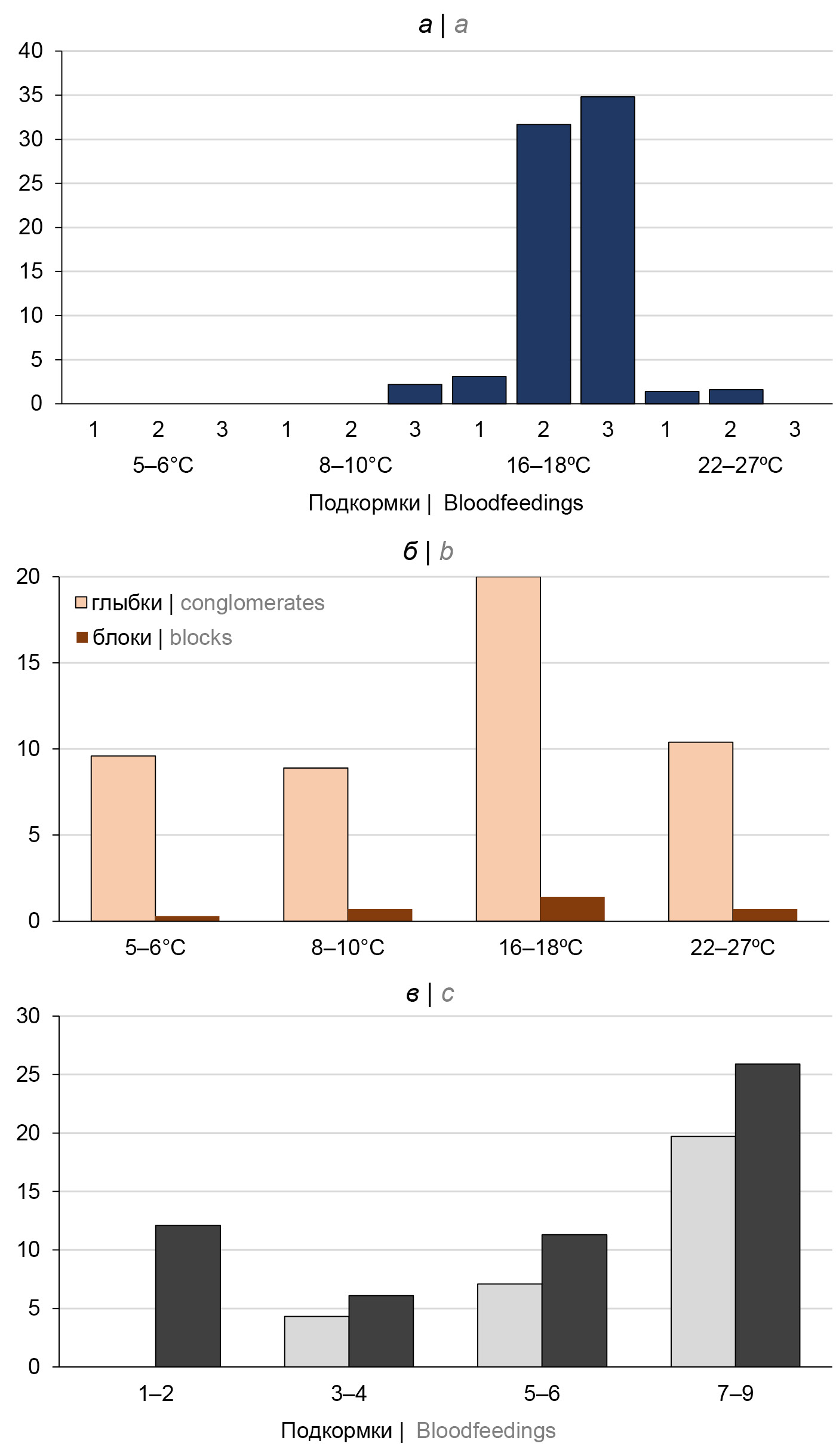 Значительно различалась динамика формирования чумным микробом глыбок и блоков в организме С. tesquorum при температуре 5–25ºС (рис. 3, а, б). Так, при 5–6ºС первые самки с «глыбками» отмечены только на 8–10-е сутки, а с «блоками» — на 18-е сутки. У самцов формирование глыбок и блоков началось одновременно с 13-х суток. Образование тех и других агрегированных форм продолжалось у обоих полов до конца опыта — по 32-е сутки. При 8–10ºС первые глыбки Y. pestis регистрировали как у самок, так и у самцов начиная с 8-х суток, и также до конца опыта (35-е сутки). Период «блокообразования» продолжался у самок с 16-х по 31-е сутки, у самцов — с 8-х по 34-е сутки. При 16–18ºС формирование агрегатов возбудителя — как глыбок, так и блоков — у С. tesquorum (без учёта пола) наблюдали с 3-х суток до конца опыта (26-е сутки). Дальнейшее повышение температуры до 22–25ºС существенно не повлияло на сроки формирования глыбок микроба. Их отмечали начиная с 3-х суток и до конца опыта (30-е сутки) у особей обоих полов. При этом период от заражения блох до начала формирования блоков увеличился по сравнению с показателями, полученными при содержании блох в температурных границах 16–18ºС. Так, первые блоки отмечены у самок на 12-е сутки, у самцов — на 7-е, а последние — на 24-е и 16-е сутки соответственно (рис. 3, а). По сравнению с опытом при 16–18ºС, сократился и период «блокообразования» (от начала до конца выявления «блокированных» особей) на 8–11 сут. Наибольшее число «блокированных» блох (рис. 3, б) отмечали в диапазоне температур от 8–10 до 16–18ºС.