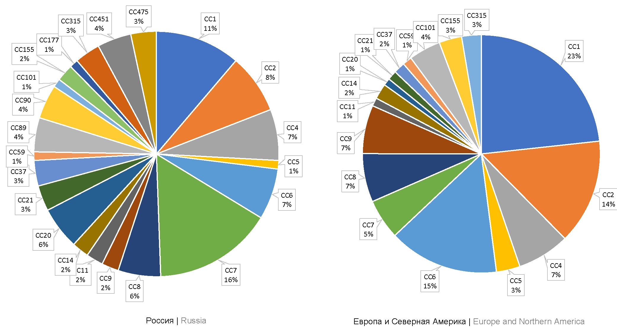 Fig. 2. CC occurrence frequency among L. monocytogenes strains from the ListiList database (Institut Pasteur, France), for Russia, countries of Europe and North America.