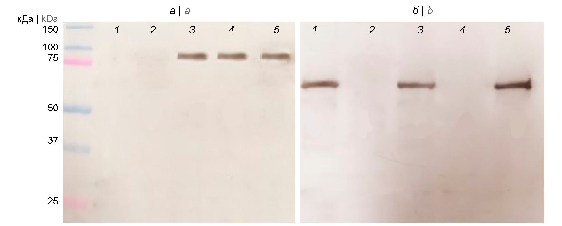 Fig. 3. Immunoblot of Listeria spp. cell lysates. a — monospecific antibodies against InlA; b — monospecific antibodies against InlB. 1 – L. monocytogenes EGDe ΔinlA; 2 — L. ivanovii ATCC 19119; 3 — L. monocytogenes EGDe (CC9); 4 — L. monocytogenes EGDe ΔinlB; 5 — L. monocytogenes L.mo49 (CC9)