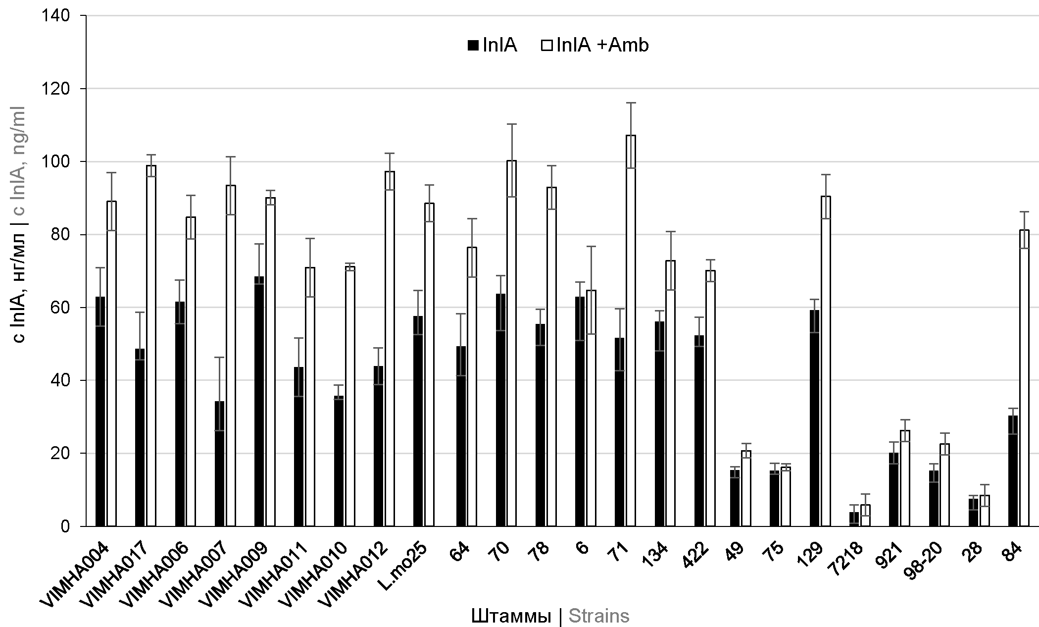 The medium supplemented with the Amberlite XAD4 adsorbent and the resulting activation of PrfA led to increased InlA concentration in all strains by 31% on average. In some strains the concentration reached the highest levels: VIMHA017 (CC1) — 99 ng/ml, VIMHA007 (CC2) — 93 ng/ml, L.mo71 — 107 ng/ml (CC7), L.mo129-3 (CC9) — 90 ng/ml.