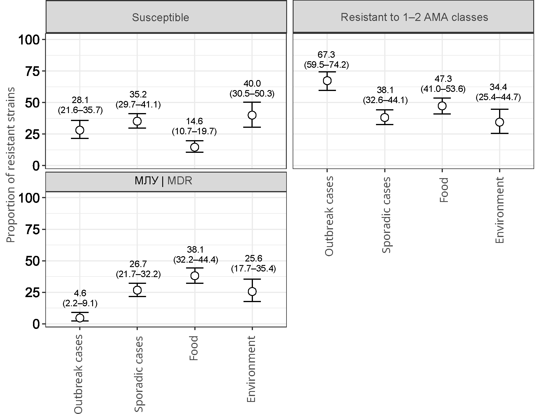 Comparative analysis of data on antibiotic bacterial resistance of Salmonella obtained in Russia in different years involves certain difficulties. One of the main reasons is continuously changing interpretation criteria and methodological approaches to testing for antibiotic bacterial resistance. These changes are occurring around the world, making it difficult to conduct an objective analysis [10]. According to previous studies, the percentage of non-typhoidal Salmonella strains resistant to various AMA classes varied significantly across different regions of Russia in different years. Resistance to aminoglycosides was shown by 1–2% to 53.1% of strains, to quinolones — from 0.0% to 59.2%, to penicillins — from 26.4% to 42.0% [11–14]. Another important factor is the limited number of studies in Russia reflecting a comprehensive analysis of the phenotypic resistance of non-typhoidal Salmonella strains in terms of the diversity of sources and geography of isolation, as well as the serotype diversity.