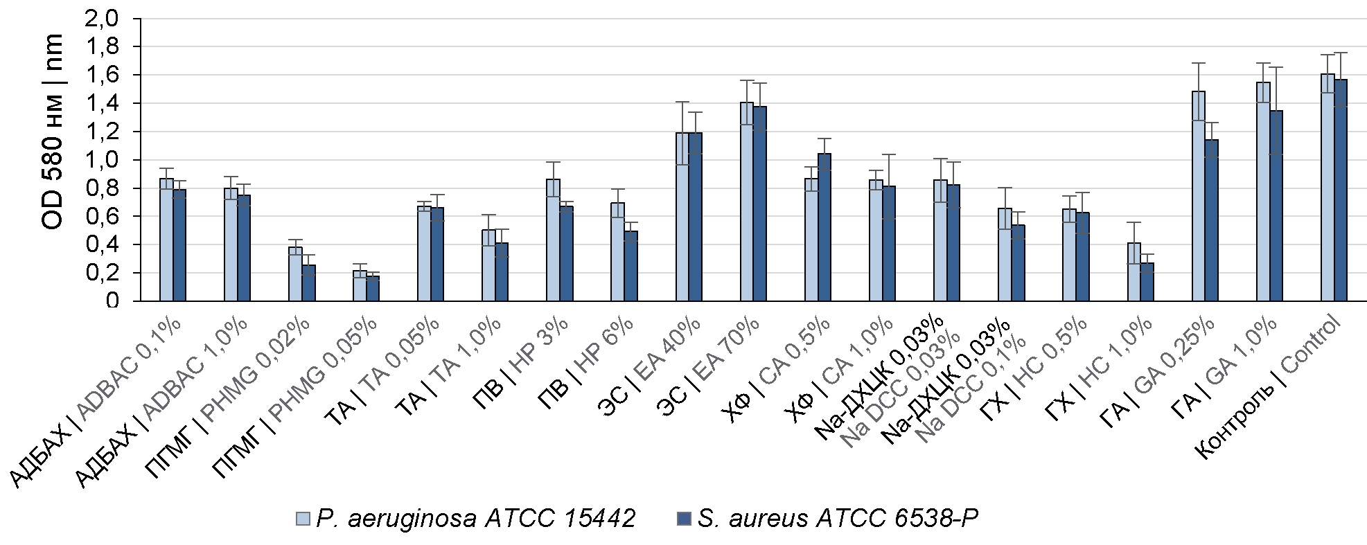 Fig. 1. Comparative assessment of the effect of disinfectants on the density of the formed BFs of P. aeruginosa ATCC 15442 and S. aureus ATCC 6538-P.