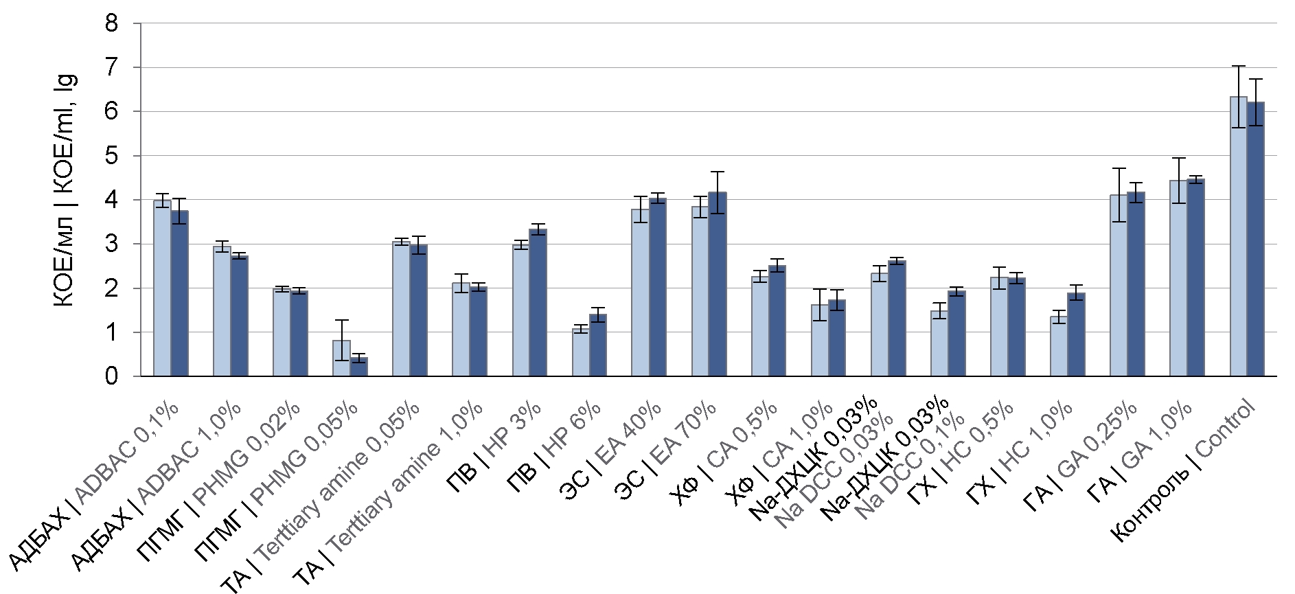 - from the group of cationic SAAs —alkyldimethylbenzylammonium chloride (ADBAC) at concentrations of 0.1–1.0%, polyhexamethylene guanidine chloride (PHMG) — 0.02–0.05%, tertiary alkylamine (TA) – 0.1–1.0%;