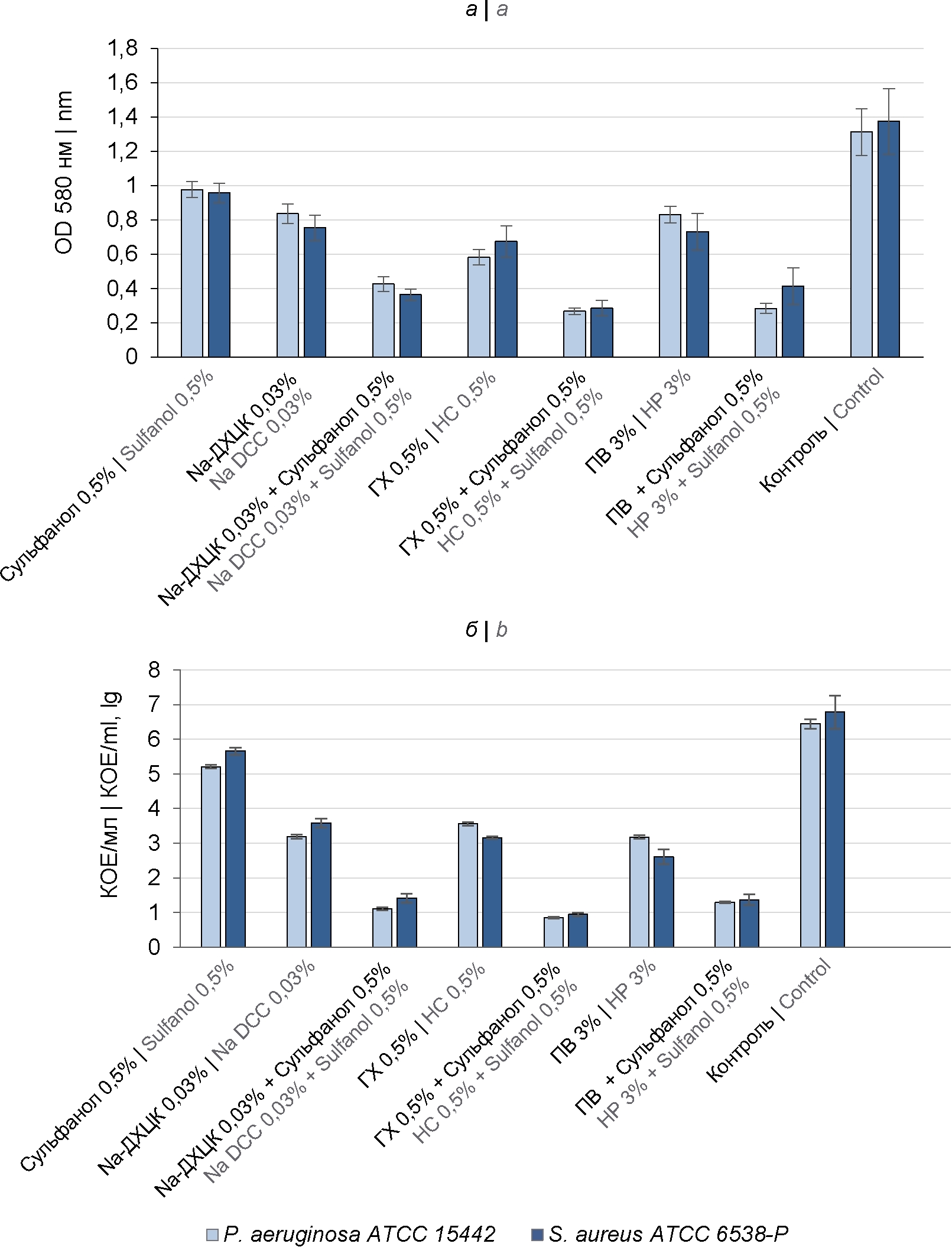 Fig. 2. Comparative assessment of the effect of disinfectants on the viability of P. aeruginosa ATCC 15442 and S. aureus ATCC 6538-P cells in BFs.