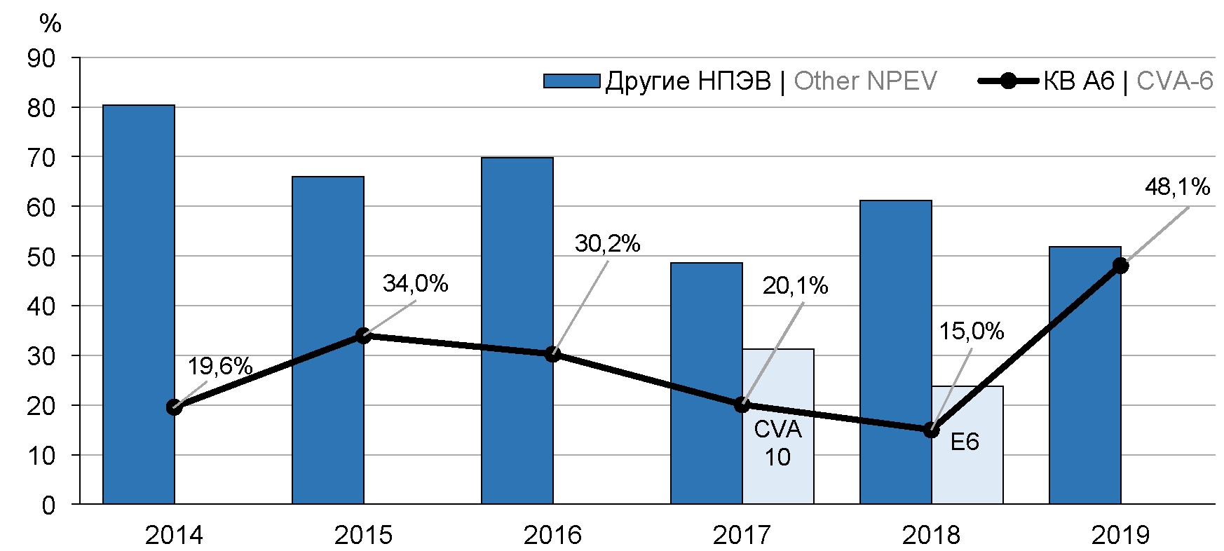 С 2014 по 2016 г. КВ-А6 выявляли чаще других ЭВ в целом по ДФО (от 19,6 до 34,0% от общего количества неполиомиелитных ЭВ), в 2017 г. лидером по числу обнаружений был КВ-А10 (31,3%), в 2018 г. — ECHO 6 (23,8%), в 2019 г. снова отмечено преобладание КВ-А6 (рис. 1).