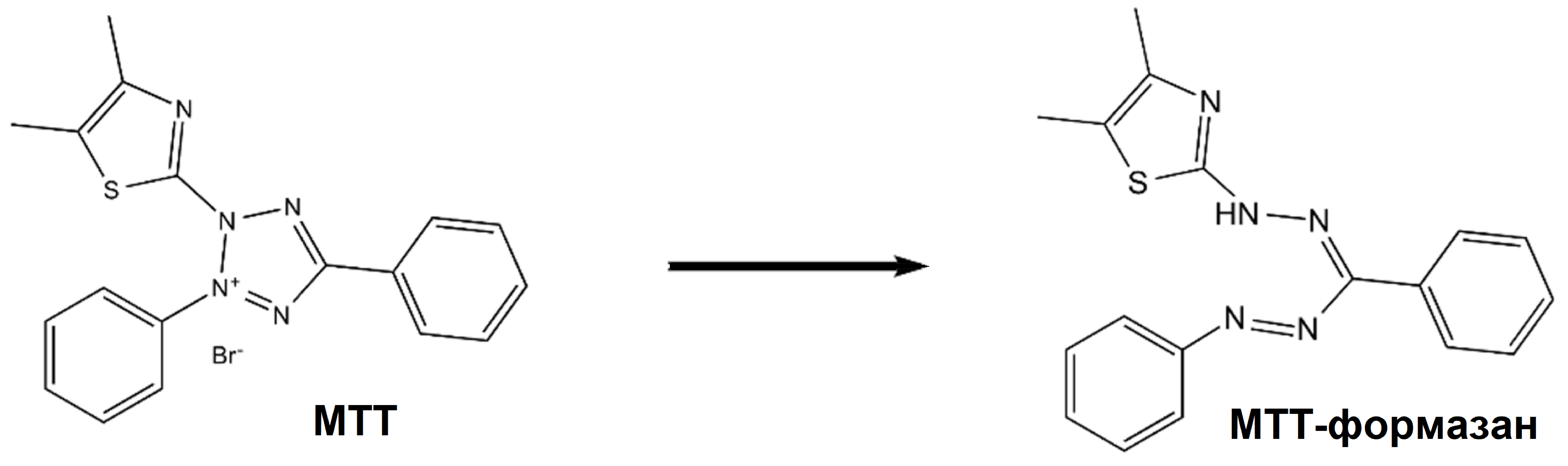 The MTT assay was used to assess the survival of Vero E6 cells under the influence of different dilutions of the virus when evaluating the infectious titer of SARS-CoV-2 strains after the 3rd passage. The essence of this method is the ability of viable cells to convert the highly soluble yellow bromide 3-(4,5-dimethylthiazol-2-yl)-2,5-diphenyltetrazolium (MTT) into insoluble intracellular crystals of (E, Z)-5(4,5-dimethylthiazol-2-yl)-1,3-diphenylformazan (MTT-formazan) under the action of intracellular dehydrogenases [27, 28]: